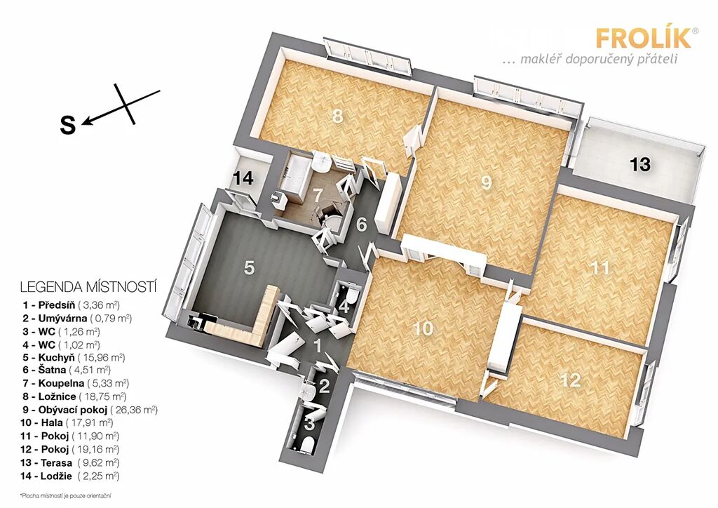 Byt je to opravdu velkorysý! Má dostatečně veliké místnosti, poctivé dřevěné parkety, velká Euro okna s dvojskly a předokenními elektrickými roletami, pěkné výhledy a orientaci na všechny světové strany. Kromě toho spoustu různých úložných vestavěných skříní a zrekonstruované původní prvky. V srdci bytu Vás jistě okouzlí nádherný prostor, který může vzniknout propojením haly (s otevírací prosklenou stěnou) a obývacího pokoje.