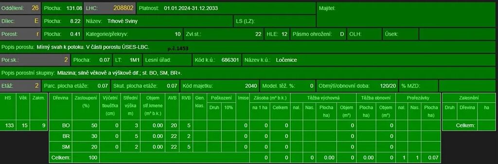 Jedná se o p.č.1452 vedená jako lesní pozemek o celkové výměře 3068 m2, stáří lesa 14 a 100 let, hlavní zastoupení dřevin dle LHO smrk, borovice, bříza.