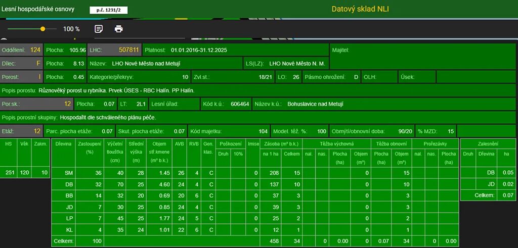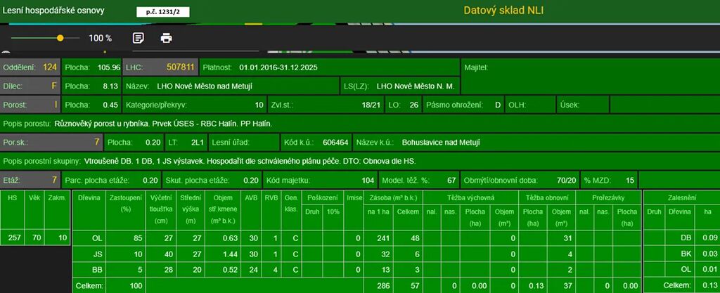 Jedná se o p.č. 1231/2 vedená jako lesní pozemek o celkové výměře 4 573 m2, vlastníme podíl 1/2 tudíž 2 287 m2.