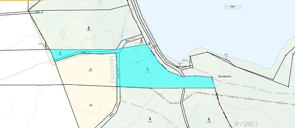Dále se jedná o p.č. 1233/5 vedená jako vodní plocha o celkové výměře 202 m2, vlastníme podíl 1/2 tudíž 101 m2.