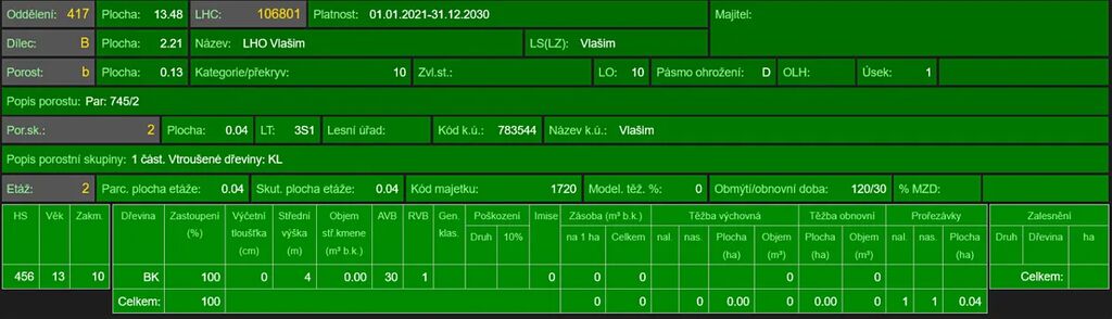 -parc. č. 745/2 - lesní pozemek o výměře 1 366 m2, přímý přístup z cesty, stáří lesa 17 a 116 let, zastoupení dřevin buk, dub, modřín, borovice