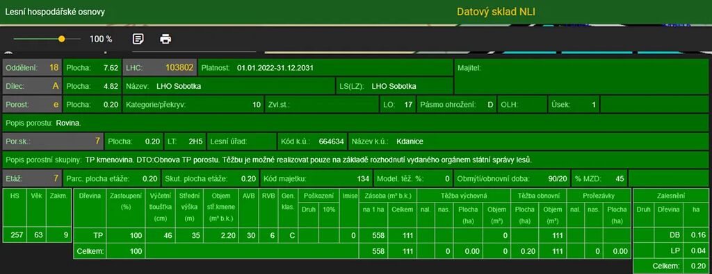 Dle LHO je stáří lesa cca 66 let, hlavní zastoupení dřevin topol.