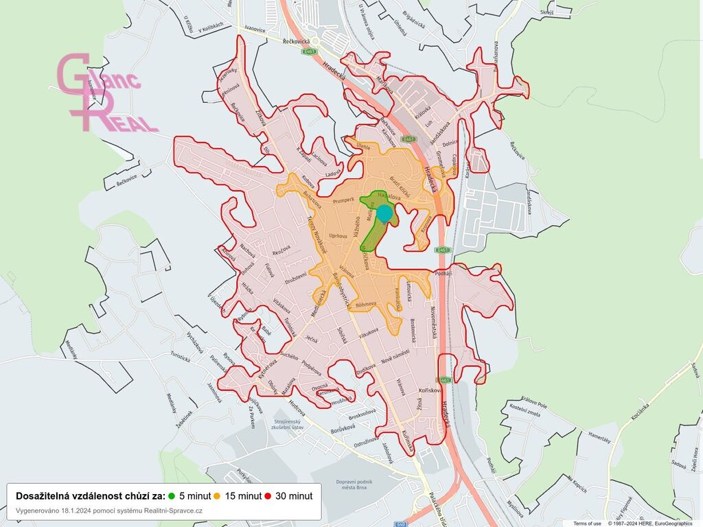 Brno Řečkovice je oblíbená a klidná lokalita s kompletní občanskou vybaveností. V okolí najdete supermarket, drogerii, poštu, banku, školu a školku – vše do 200 m. Dopravní spojení do centra Brna je skvělé. Autobusová zastávka je u domu, tramvajová přibližně 5 minut chůze.