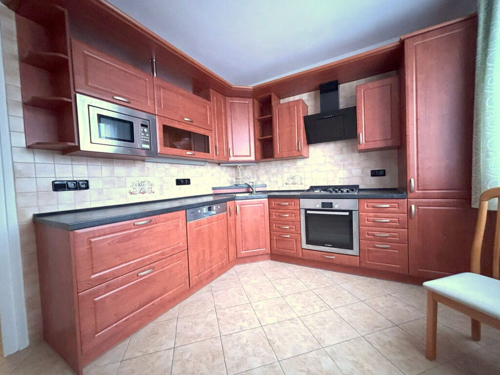 Kuchyňský kout disponuje plynovou varnou deskou, elektrickou troubou, vestavěnou mikrovlnou troubou, designovou digestoří, myčkou na nádobí a ledničkou.