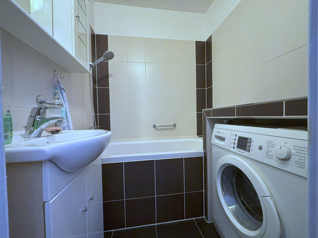 Koupelna je potom zařízena vanou, koupelnovou skříňkou, galerkou, a pračkou. Sušička je umístěna ve zvláštní místnosti.
