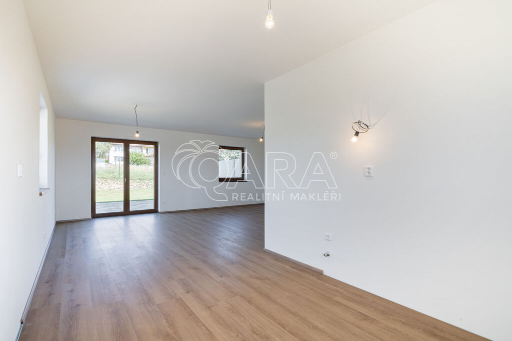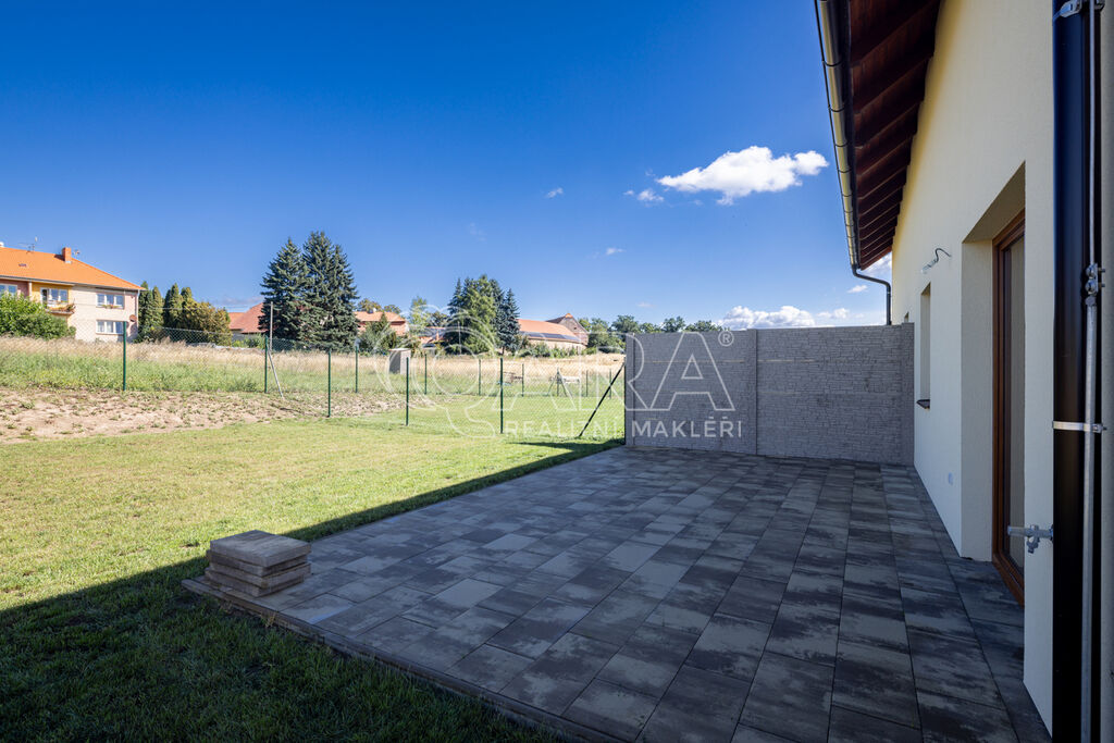 Dům je francouzským oknem v obývacím pokoji přirozeně propojen se zahradou o velikosti 239 m² (jedná se o čistou plochu zahrady ve které není započítána zastavěná plocha, parkoviště a prostor před domem), jejíž součástí je na dům navazující 28 m² vydlážděná terasa, díky jejíž severní orientaci si můžete venkovní prostor užít i v horké a slunné dny. Zahrada je kompletně oplocená, zatravněná a čeká na případné finální úpravy od nových majitelů. Akumulační nádrž (3 m3) pro budoucí hospodaření s dešťovou vodou je již na pozemku umístěna.