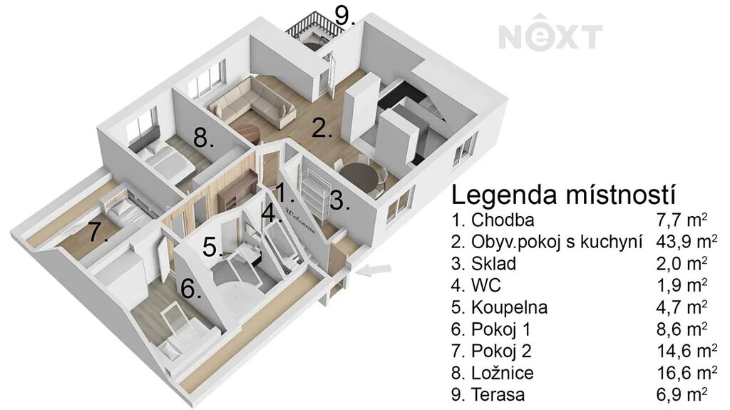 K dispozici je chodba (7,7 m2), obývací pokoj s kuchyňským koutem (43,9 m2), komora (2 m2), dva pokoje (8,6 m2, 14,6 m2), ložnice (16,6 m2), koupelna s rohovou vanou (4,7 m2) a samostatné WC (1,9 m2). K bytu navíc náleží sklep (6,9 m2) a terasa (21 m2) s výhledem do okolí.