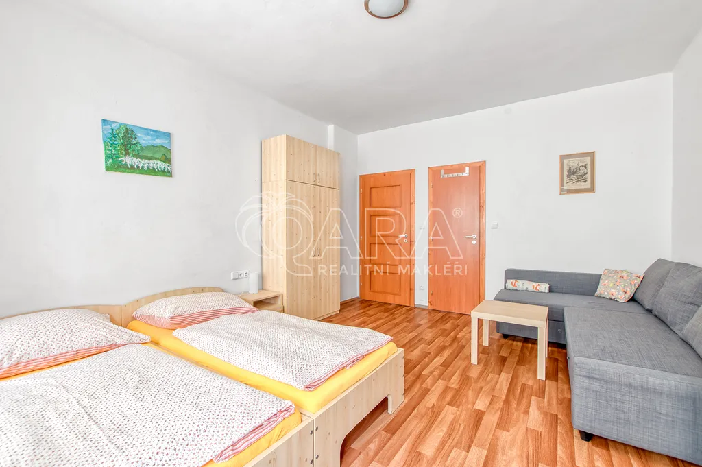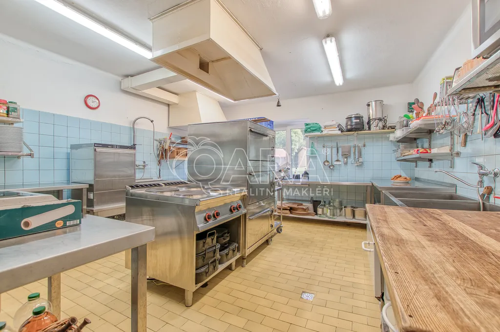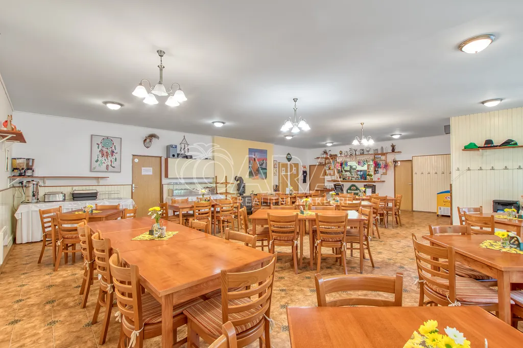 Hlavní budova penzionu o ploše 182 m² v přízemí a dalších 110 m² v patře prošla částečnou rekonstrukcí. V roce 2010 byla vyměněna všechna okna za plastová s dvojskly, v roce 2015 proběhla kompletní rekonstrukce pokojů včetně elektroinstalace, rozvodů vody a odpadů. V patře se nachází pět pokojů s vlastním sociálním zázemím, s celkovou kapacitou 16 hostů. Přízemí tvoří plně funkční restaurace s barem, kuchyní, sklady, technickým zázemím i klenbovým sklepem. Restaurace má kapacitu 60 míst uvnitř a dalších 30 na venkovní terase.