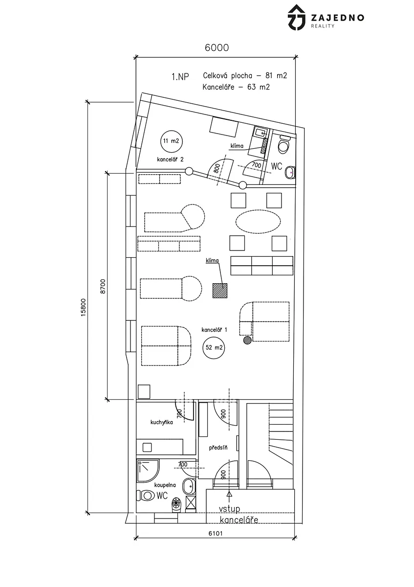 Vchod je samostatný přímo z ulice přes vstupní předsíň, ze které je vchod do místnosti s WC a sprchovým koutem. V této místnosti je umístěn plynový kotel k samostatnému vytápění kanceláří.