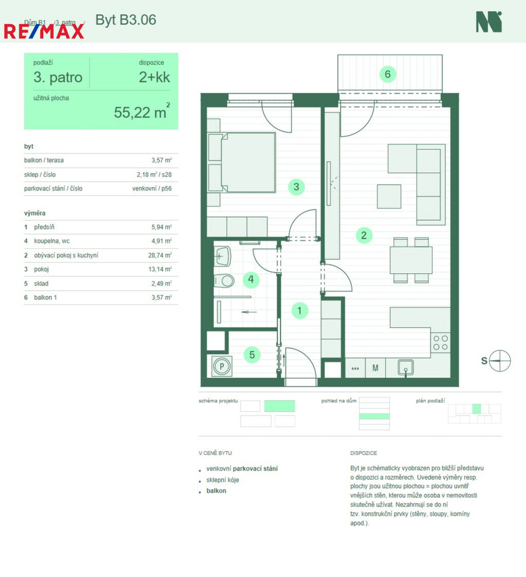 Nabízený byt B3.06 s dispozicí 2kk se nachází ve 3.nadzemním podlaží. Užitná plocha samotného bytu je 55,22 m2 plus balkon o celkové výměře 3,57 m2 plus 2,18 m2 sklepní prostory. Součástí ceny je i výhradní vnější parkovací stání.