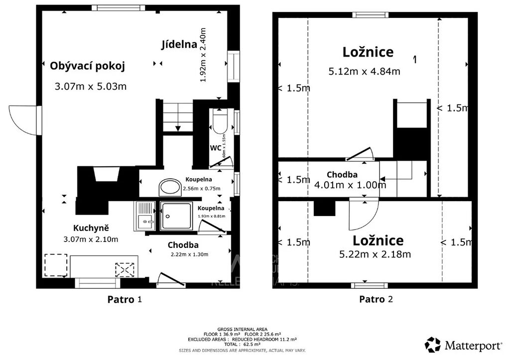 Zastavěná plocha činí 47 m², užitná plocha dle matterportu je cca 62,5 m². Stavba z cihly o šířce 20 cm působí bytelně a prošla v roce 2023 významnou modernizací.