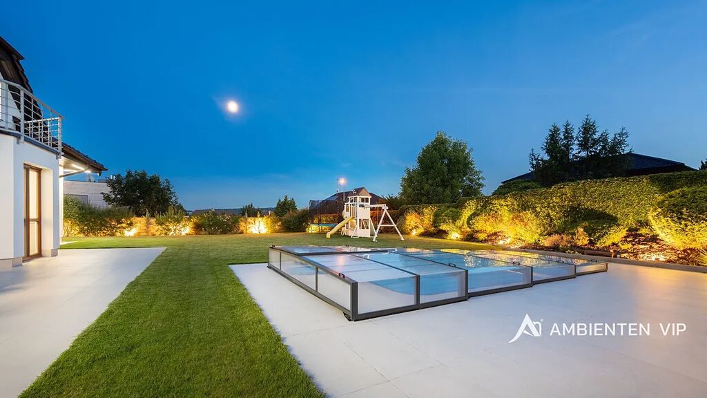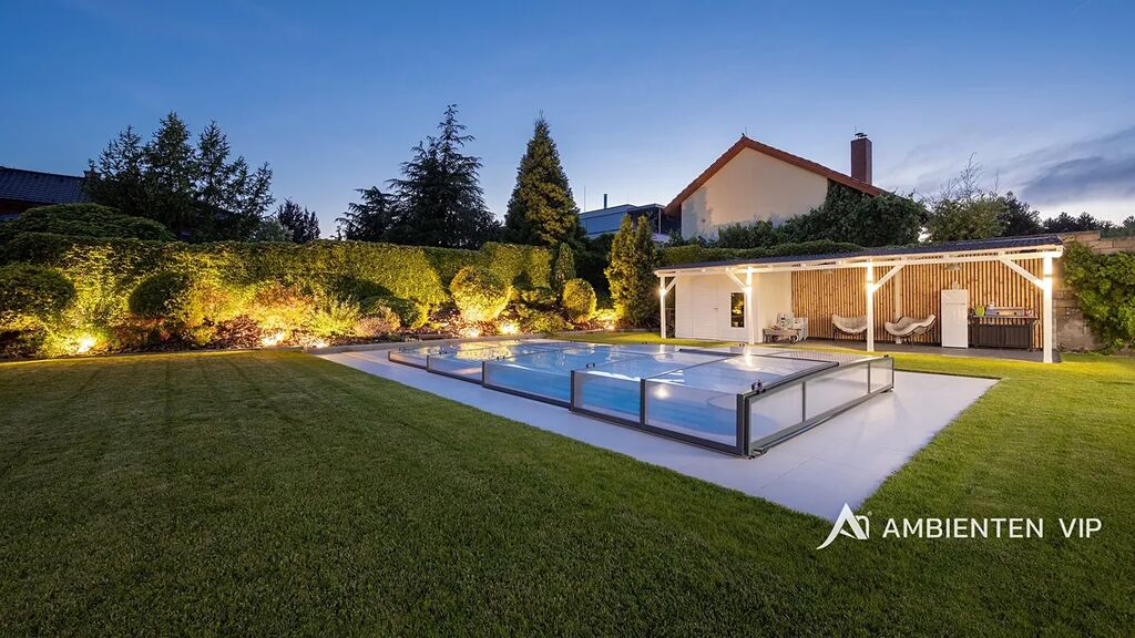Zahrada je oplocená, nasvícená a osázená okrasnými stromy a keři. V rámci zahrady se nachází zahradní domek s posezením zastřešený pergolou. Bazénová vana je v provedení plast s kompletně novým hliníkovým krytem.