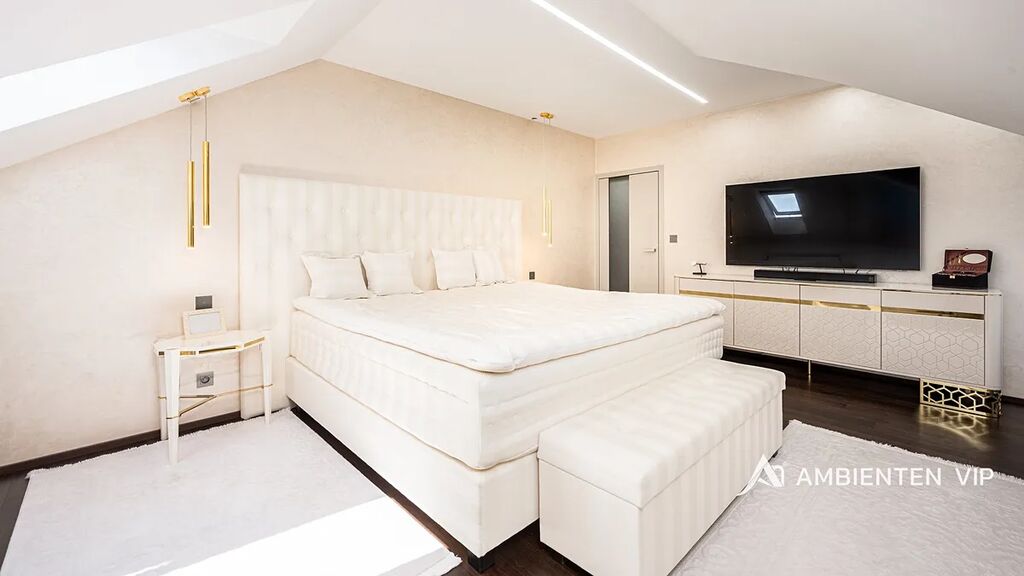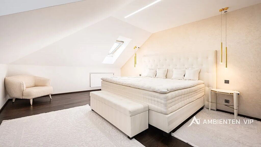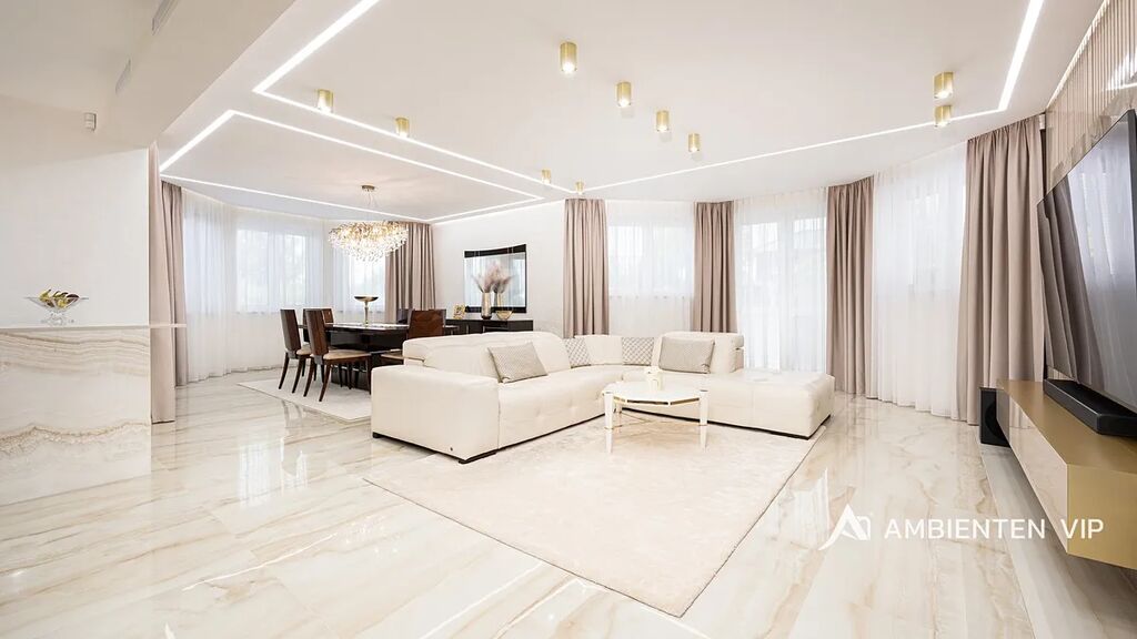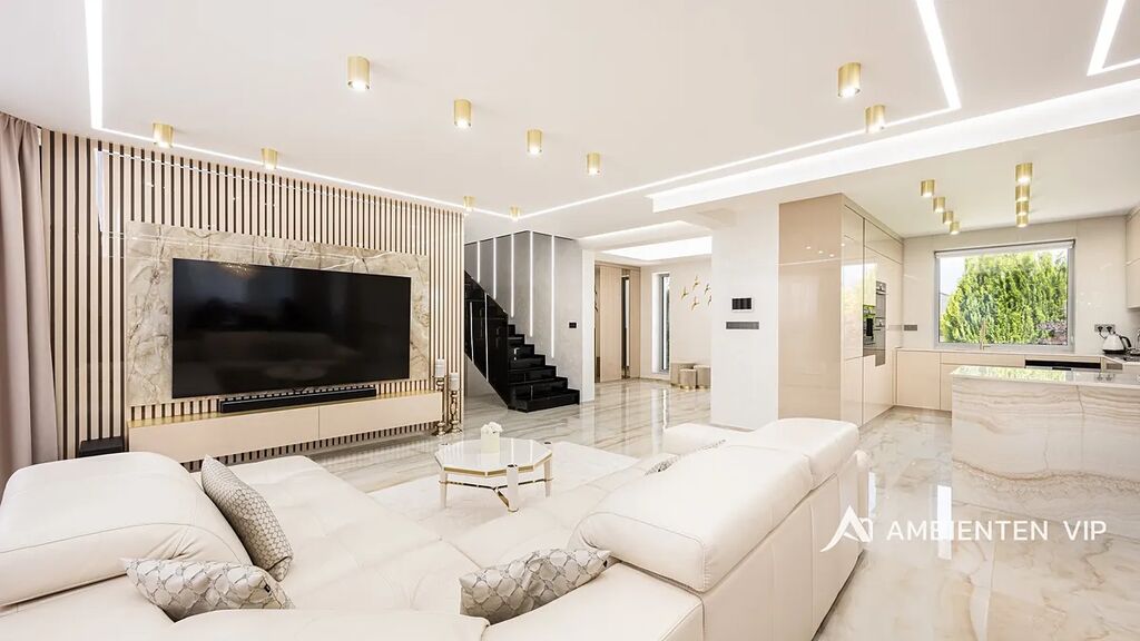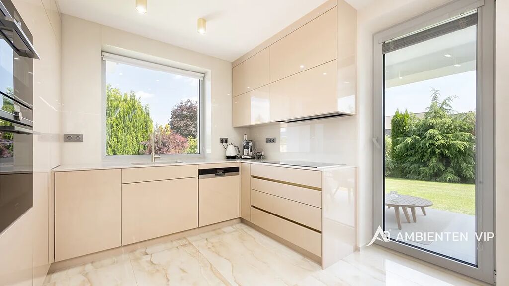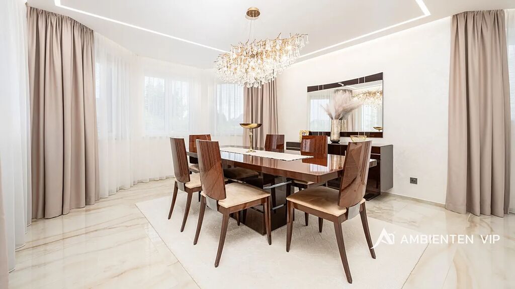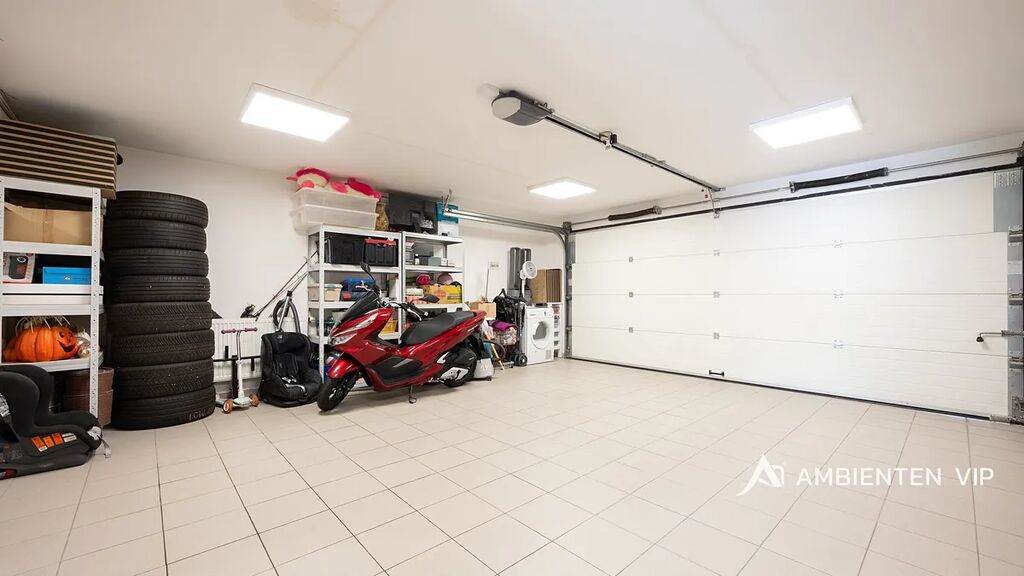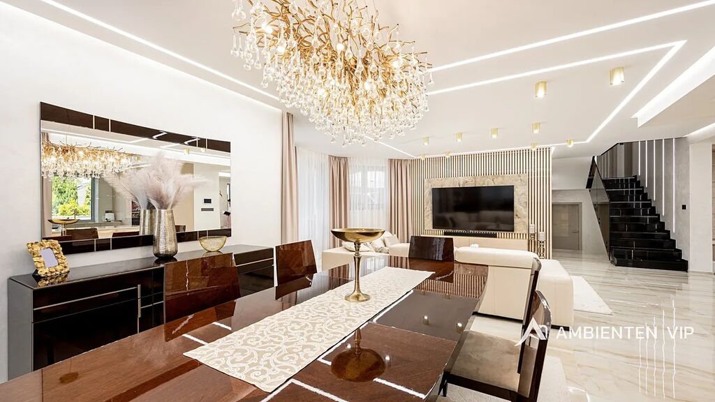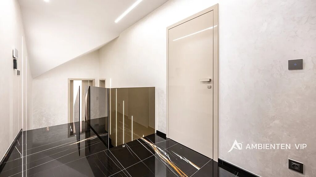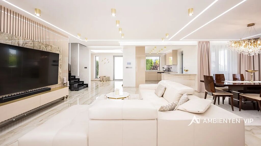 V přízemí vily se nachází honosná vstupní hala, která je vybavena vestavnými skříněmi na míru. Ze vstupní haly vstupujete do otevřené dispozice obývacího prostoru s luxusní jídelnou a nadstandardně vybavenou kuchyní. Kuchyňská linka je na míru vyrobena od firmy Vagunda a je vybavena moderními spotřebiči značky Siemens. Hlavní dominantou kuchyně je onyxový prvek s podsvícením, který slouží jako barový ostrůvek s vestavěnou vinotékou. Z kuchyně vede přímý vstup na zastřešenou terasu. Stěny obývacího prostoru a vstupní haly jsou provedeny speciální dekorační technikou benátský štuk, který dodává interiéru reprezentativnost a osobitost. Dále se zde nachází dětský pokoj, koupelna se sprchovým koutem a toaletou, technická místnost a garáž pro dva vozy. Technická místnost nyní slouží jako prádelna a nachází se zde plynový kotel. Z obývacího pokoje a chodby vedou dva přímé vstupy na venkovní terasu s posezením a na zahradu. Mezipatro domu disponuje luxusní nadstandardní ložnicí a samostatnou šatnou s velkým množstvím úložného prostoru. V druhém patře vily se nachází 3 samostatné pokoje a koupelna s vanou, sprchovým koutem, umyvadlem, toaletou a bidetem. Ze všech pokojů včetně koupelny vedou vstupy na balkon. Půdní prostor je pochozí a plně funkční k uložení dalších věcí.