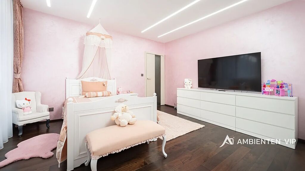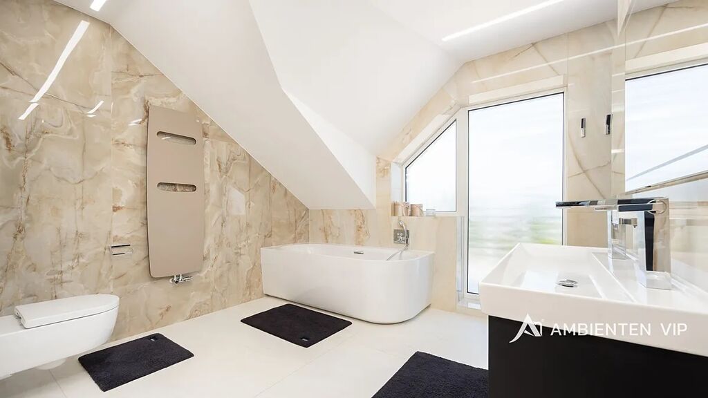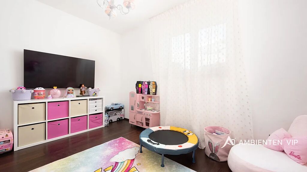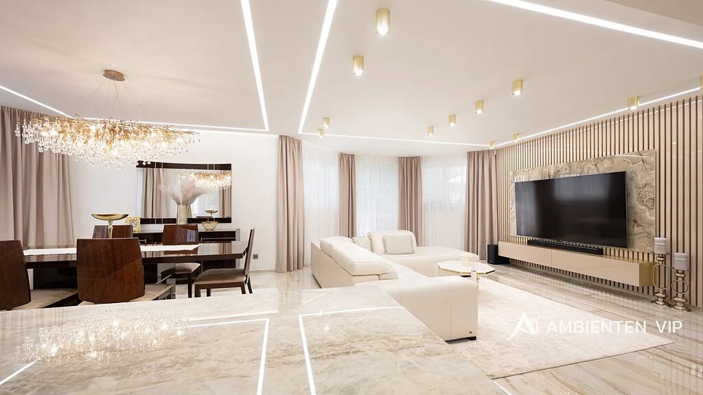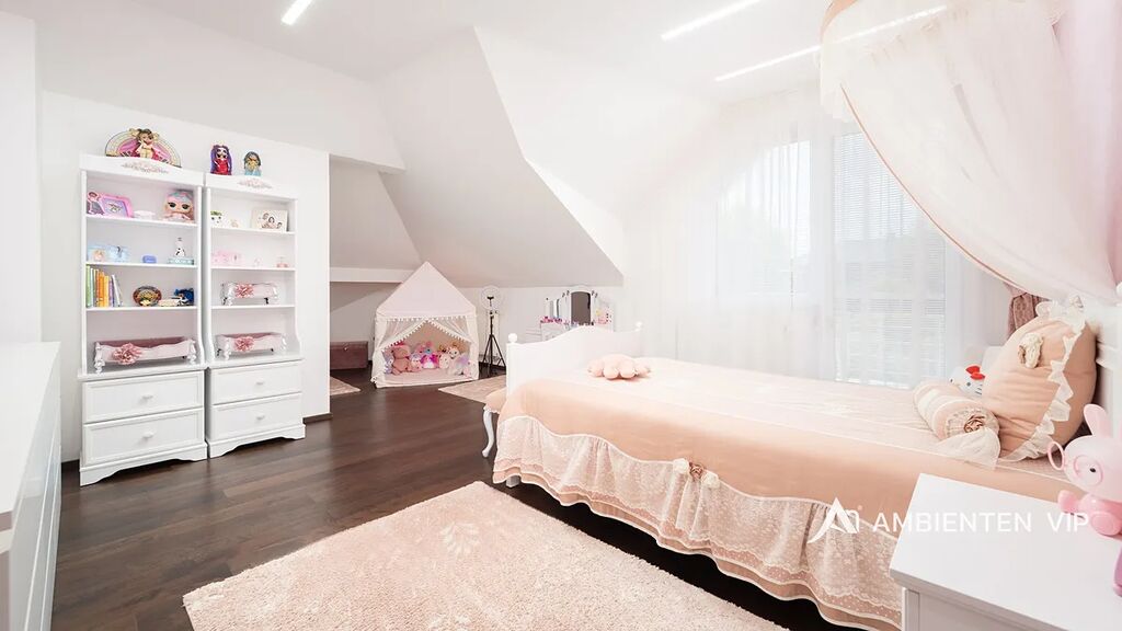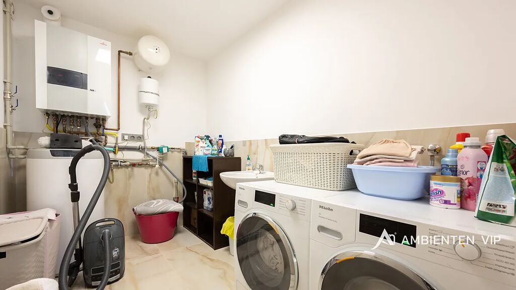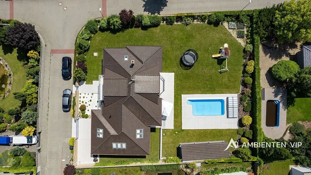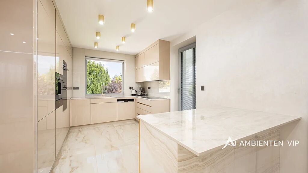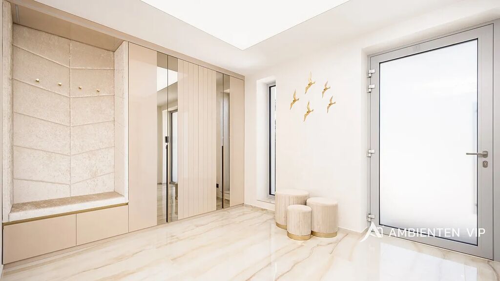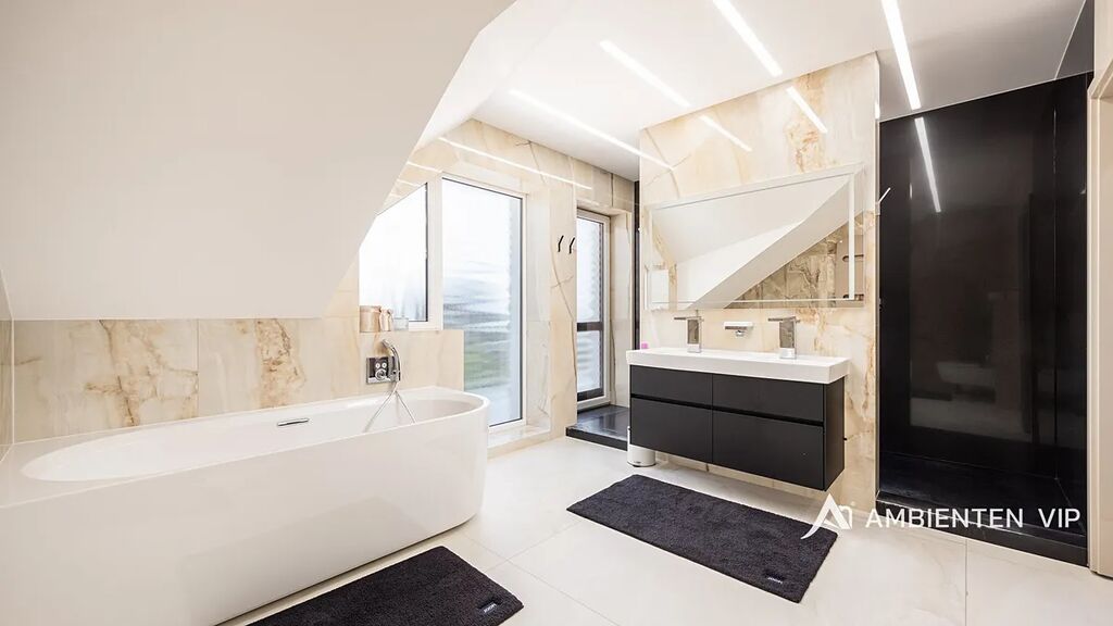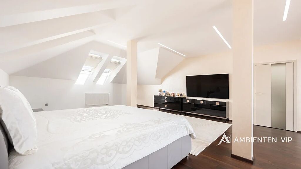 V přízemí vily se nachází honosná vstupní hala, která je vybavena vestavnými skříněmi na míru. Ze vstupní haly vstupujete do otevřené dispozice obývacího prostoru s luxusní jídelnou a nadstandardně vybavenou kuchyní. Kuchyňská linka je na míru vyrobena od firmy Vagunda a je vybavena moderními spotřebiči značky Siemens. Hlavní dominantou kuchyně je onyxový prvek s podsvícením, který slouží jako barový ostrůvek s vestavěnou vinotékou. Z kuchyně vede přímý vstup na zastřešenou terasu. Stěny obývacího prostoru a vstupní haly jsou provedeny speciální dekorační technikou benátský štuk, který dodává interiéru reprezentativnost a osobitost. Dále se zde nachází dětský pokoj, koupelna se sprchovým koutem a toaletou, technická místnost a garáž pro dva vozy. Technická místnost nyní slouží jako prádelna a nachází se zde plynový kotel. Z obývacího pokoje a chodby vedou dva přímé vstupy na venkovní terasu s posezením a na zahradu. Mezipatro domu disponuje luxusní nadstandardní ložnicí a samostatnou šatnou s velkým množstvím úložného prostoru. V druhém patře vily se nachází 3 samostatné pokoje a koupelna s vanou, sprchovým koutem, umyvadlem, toaletou a bidetem. Ze všech pokojů včetně koupelny vedou vstupy na balkon. Půdní prostor je pochozí a plně funkční k uložení dalších věcí.