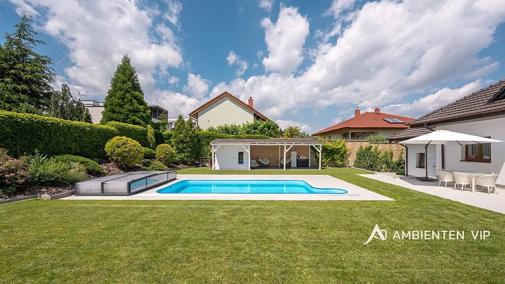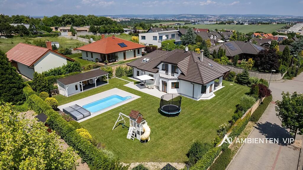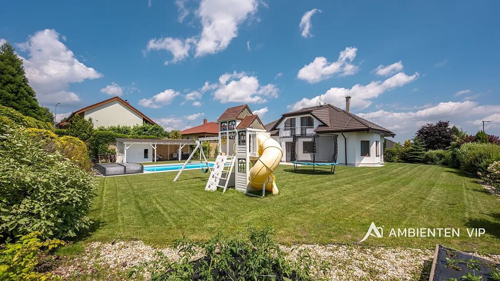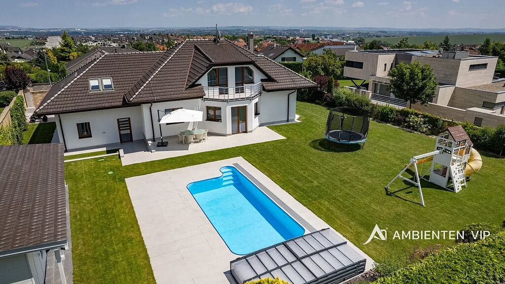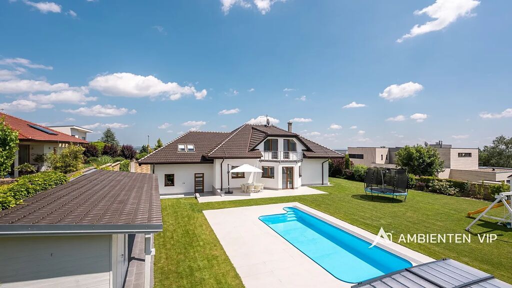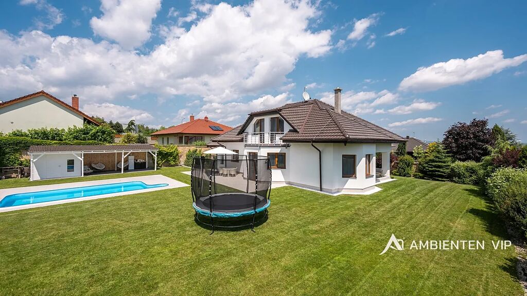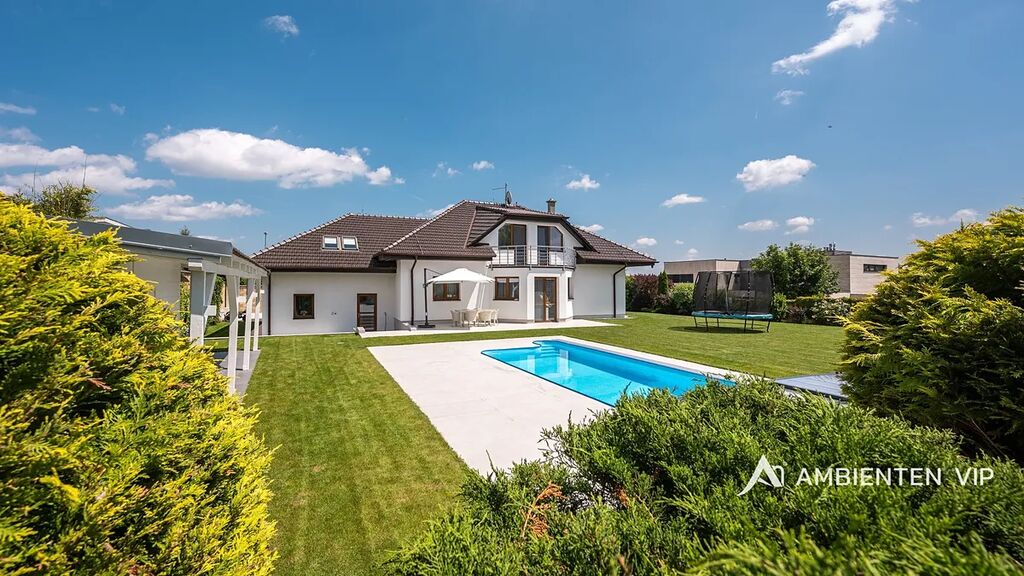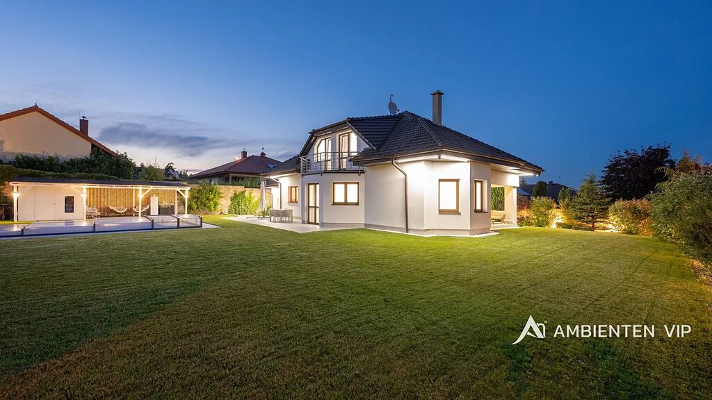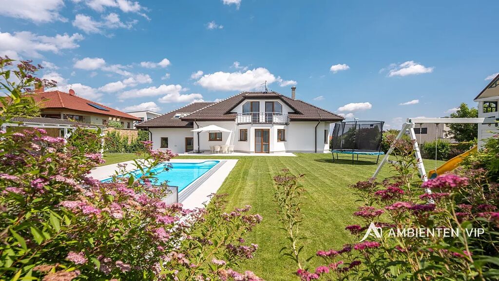 AMBIENTEN VIP si vám dovoluje exkluzivně nabídnout prodej luxusní třípodlažní vily o dispozici 6+kk se dvěma koupelnami, okrasnou zahradou, bazénem a garáží pro dva vozy v obci Moravany u Brna. Nemovitost prošla kompletní rozsáhlou rekonstrukcí a nevyžaduje žádné investice. Je v perfektně technickém stavu. Tato nemovitost uspokojí a velice náročné klienty. Celková užitná plocha domu činí 360 m² a CP pozemku činí 1188 m².