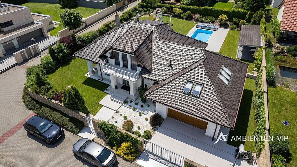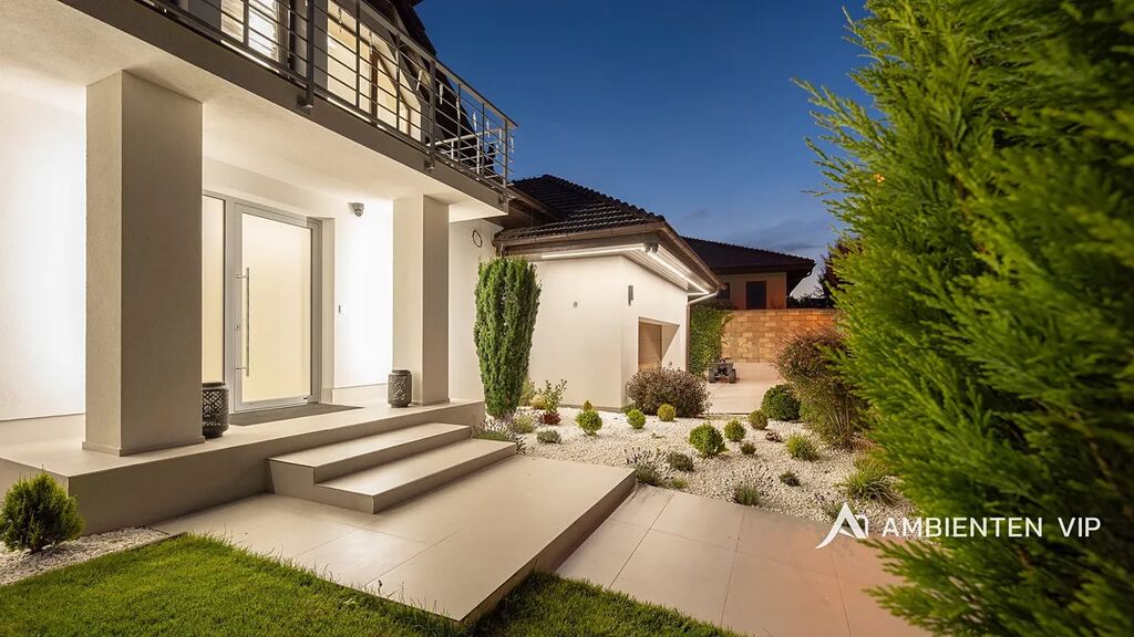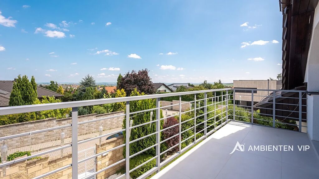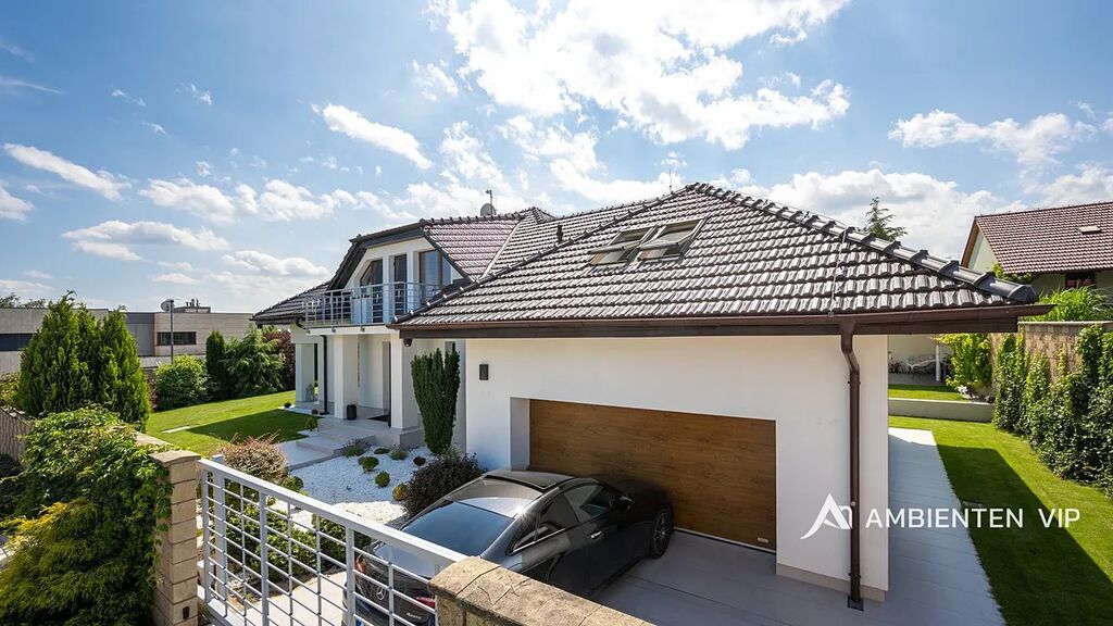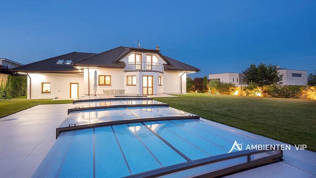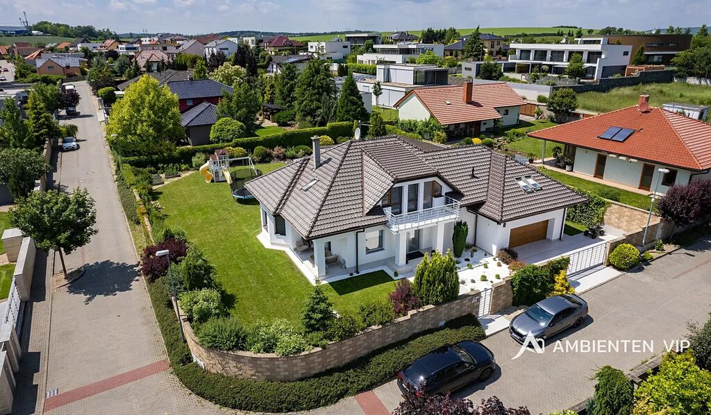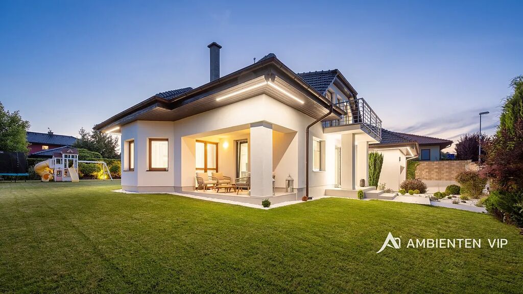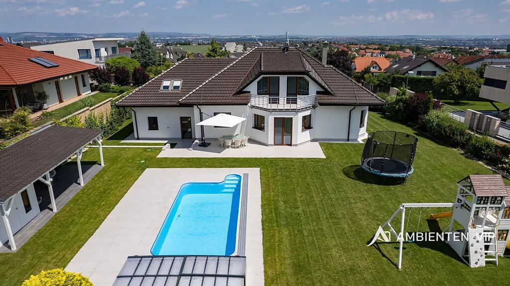 AMBIENTEN VIP si vám dovoluje exkluzivně nabídnout prodej luxusní třípodlažní vily o dispozici 6+kk se dvěma koupelnami, okrasnou zahradou, bazénem a garáží pro dva vozy v obci Moravany u Brna. Nemovitost prošla kompletní rozsáhlou rekonstrukcí a nevyžaduje žádné investice. Je v perfektně technickém stavu. Tato nemovitost uspokojí a velice náročné klienty. Celková užitná plocha domu činí 360 m² a CP pozemku činí 1188 m².