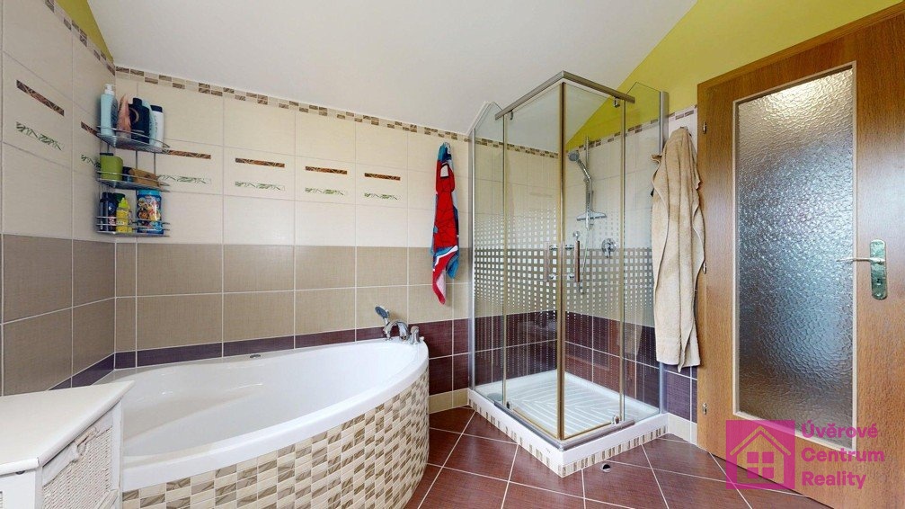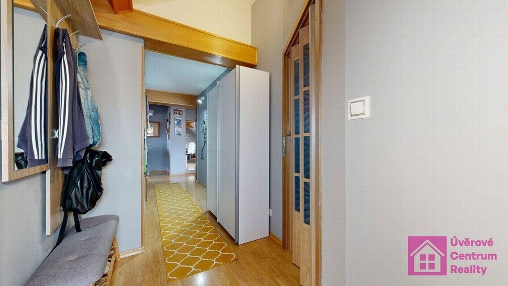 Dispozice: schodiště, chodba se šatnou, kuchyně, ložnice, obývací pokoj, koupelna (vana i sprchový kout), toaleta a dva pokoje. Půdorys bytu naleznete ve fotogalerii.