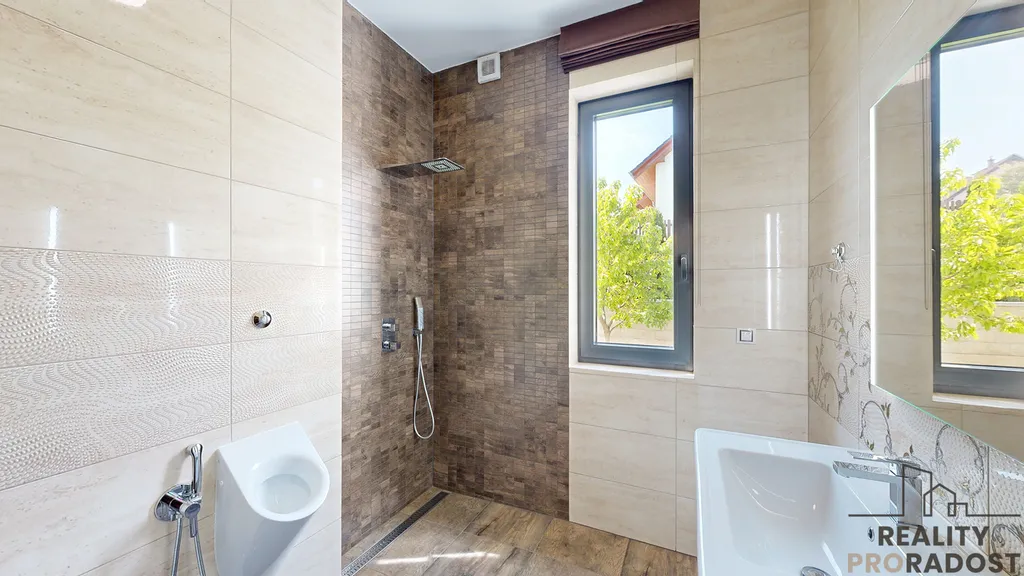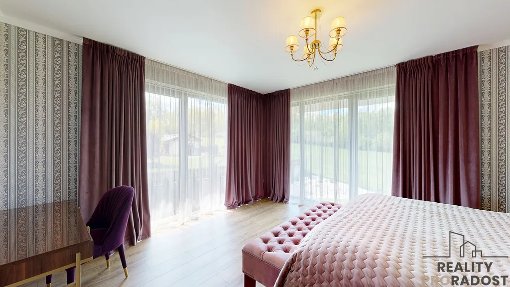 - Počet místností: 3 ložnice + 1 pokoj v přízemí + obývací pokoj s jídelnou + kuchyně + sauna + relaxační zóna + 3 koupelny + šatny