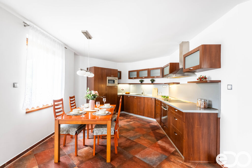 Dům je z roku 2009, je vidět, že o něj bylo dobře postaráno. Je částečně vybavený nábytkem, kuchyňská linka má všechny vestavěné elektrospotřebiče včetně lednice s mrazákem. Plastová okna s vnitřními žaluziemi a elektricky ovládanými venkovními roletami a částečně s manuálními roletami. Na podlahách je plovoucí podlaha a dlažba, vytápění je řešeno podlahovým topením a radiátory napojenými na elektrokotel. K tomu je v domě krbová vložka s výměníkem a rozvodem tepla do všech místností, ohřev vody zajišťuje bojler. Dispozice nabídne prostorný obývací pokoj s krbem propojený s kuchyní a jídelnou, ložnici, dva dětské pokoje, pracovnu, šatnu, koupelnu s vanou i sprchou, samostatné WC, technickou místnost a přímý vstup z dvojgaráže.