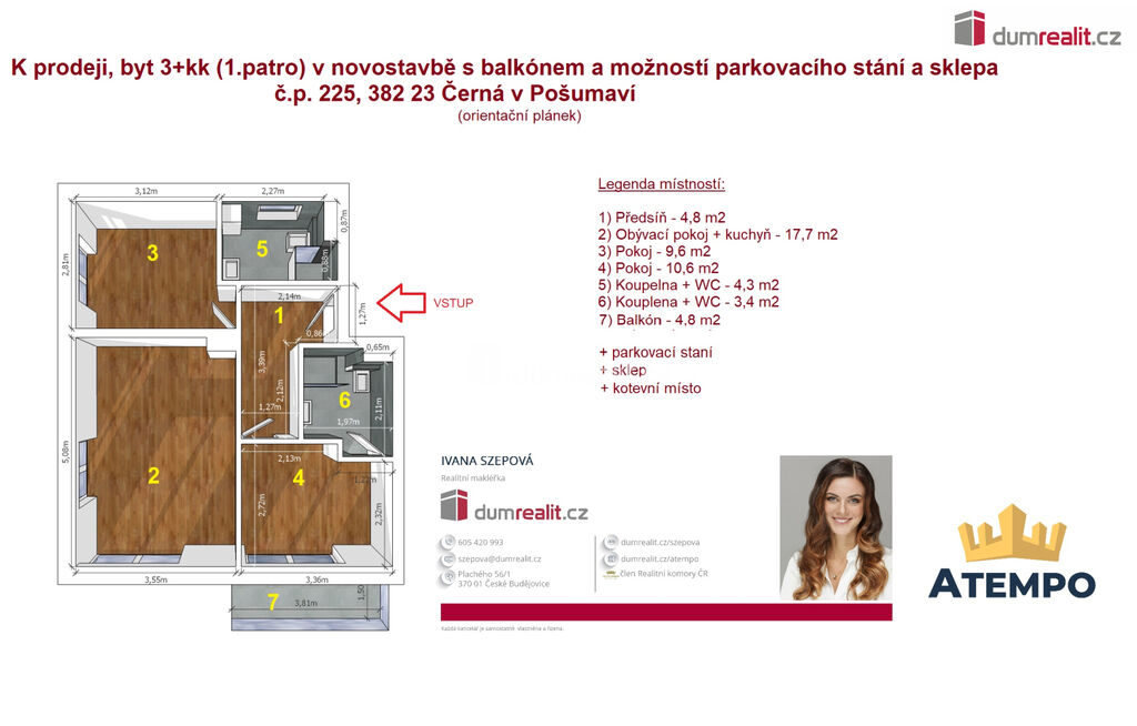 Dumrealit.cz Vám zprostředkuje prodej bytové jednotky 3+kk s balkónem v moderní novostavbě, s parkovacím stáním a sklepem v obci Černá v Pošumaví, č.p. 225, u Lipenské vodní nádrže. Dispozice bytové jednotky naleznete na orientačním plánku mezi fotografiemi. Byt je situovaný na jižní a západní světovou stranu. Dostatek světla v bytě zajišťují posuvná francouzská okna s izolačními trojskly. Prodávaný byt o výměře 52,82 m² se nachází v zatepleném zděném bytovém domě s výtahem. Bytový dům byl zkolaudován v roce 2023. Dále je možno dokoupit kotevní místo za 250.000,-Kč. Vytápění zajišťuje tepelné čerpadlo napojené na podlahové topení. Bytový dům je napojen na elektřinu, veřejný vodovod a obecní kanalizaci. Úklid společných prostor zajišťuje úklidová služba. Veškerá občanská vybavenost (škola, mateřská školka, obchod, restaurace, pošta, autobusová zastávka) je v docházkové vzdálenosti. Byt se nachází přímo u Lipenské vodní nádrže - Malé Lipno a u cyklostezky. Okolí Lipenské vodní nádrže je známé tím, že se zde nachází zázemí pro letní i zimní sporty (sjezdovky, cyklostesky, stezka korunami stromů, bobová dráha, lanový park, atd.). Doporučuji osobní prohlídku, byt je po nainstalování kuchyňské linky připraven ihned k nastěhování. Více informací Vám poskytne makléřka Ivana Szepová z realitní kanceláře A TEMPO fungující pod ochrannou známkou dumrealit.cz. Zajistíme Vám financování a veškerý právní servis. Ev. číslo: 652499.