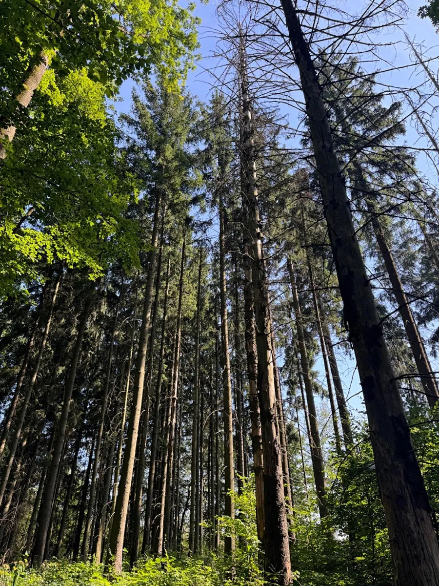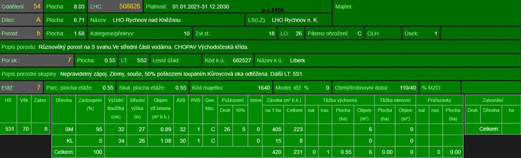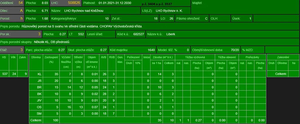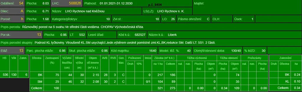 - p.č. 3404 vedená jako lesní pozemek o celkové výměře 16 126 m2, vlastníme podíl 1/3 tedy 5 375 m2 (stáří lesa 134 let - hlavní zastoupení dřevin buk smrk, stáří lesa 74let - hlavní zastoupení dřevin smrk, javor a stáří lesa 28 let - hlavní zastoupení dřevin javor, jeřáb, bříza, buk, vrba, topol, smrk)