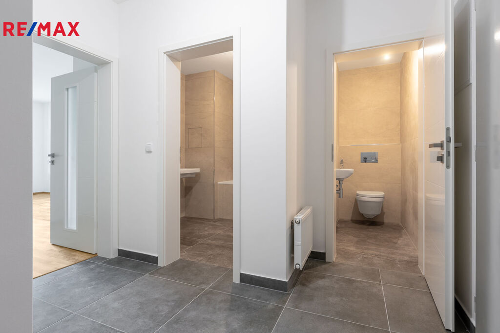 - Velkoformátová dlažba v koupelně a na WC přidává bytu moderní vzhled.