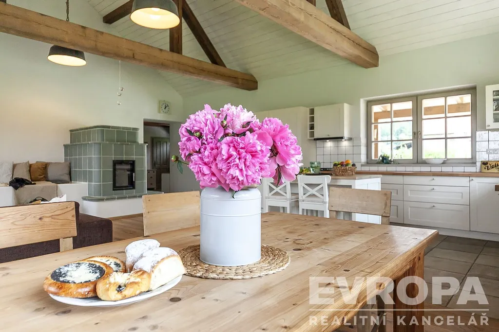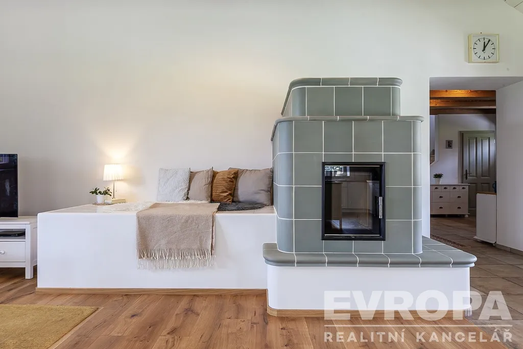 • Přízemí: velkorysý obytný prostor s kuchyní, jídelnou a obývákem, kde centrem dění jsou kachlová kamna s lavicí na ležení a akumulací tepla na celý den. Z obývacího pokoje vyjdete přímo na slunnou terasu, odkud si můžete vychutnat rána v naprostém tichu. Dále prostorná koupelna a dva pokoje.
