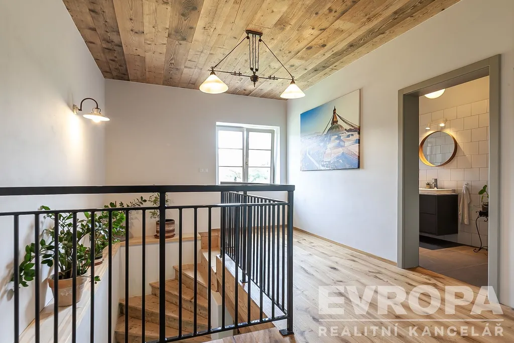 • Patro: tři světlé pokoje s výhledy do krajiny, druhá koupelna a galerie se vstupem na půdu (90 m²).