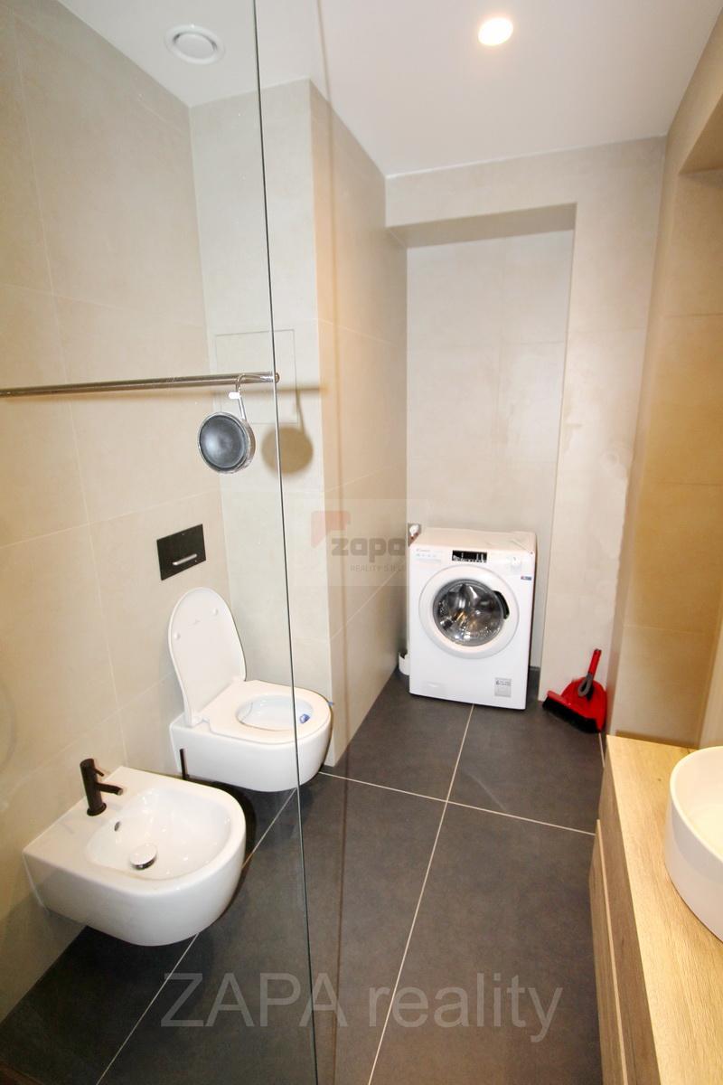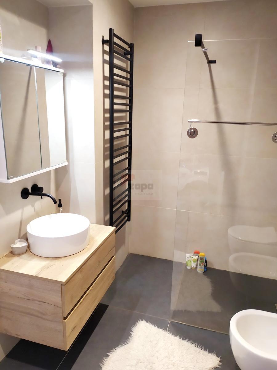 Koupelna je prostorná, s velkým sprchovým koutem, s WC, bidetem a pračkou se sušičkou.