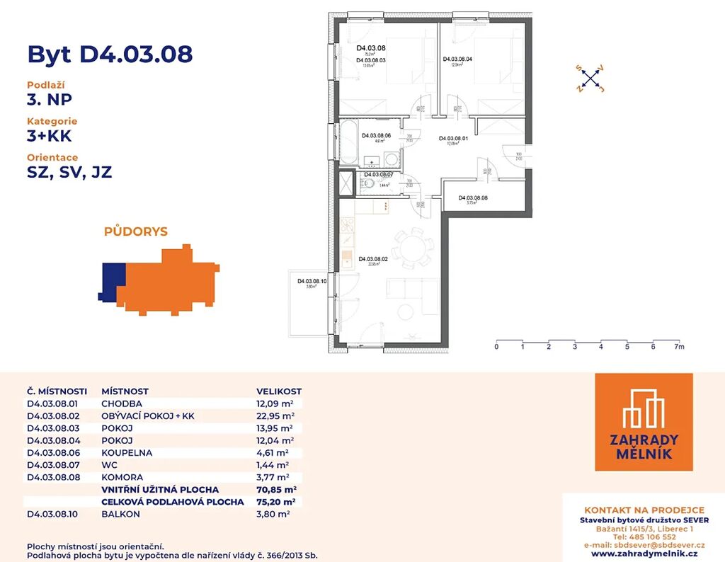 Jedná se o byt 3+kk o velikosti 75,2 m2 s balkónem o velikosti 3,80 m2. Byt se nachází ve 3. nadzemním podlaží moderní novostavby s výtahem.