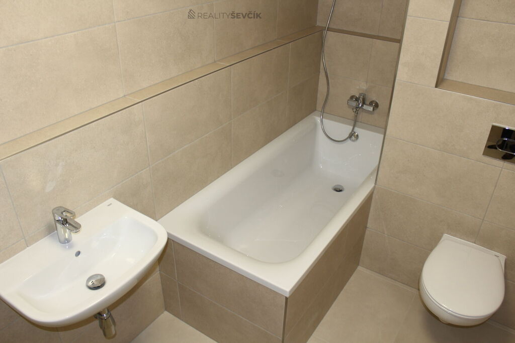 Nabízíme k pronájmu krásný slunný byt 2+kk o výměře 44 m2 s terasou 17 m2 v novostavbě bytového domu v ul. Potoční v Hluboké nad Vltavou. Byt je umístěn v 3.NP nového bytového domu (s výtahem) v Hluboké nad Vltavou v blízkosti OD Billa. Byt se stává ze vstupní chodby, samostatné komory, koupelny s vanou a WC, dále pak z obývacího pokoje s kuchyňským koutem a samostatné ložnice. Z obývacího pokoje a z ložnice je vstup na krásnou terasu, která je situována na západ . Součástí bytu je kompletní osvětlení všech pokojů, dále pak vybavená kuchyňská linka včetně elektrospotřebičů (sklokeramická deska, trouba, digestoř a myčka). Na podlahách jsou dlažby a vinyl v dekoru dřeva. Vytápění a ohřev vody je zajištěn centrálním kotlem na plyn a v každém bytě je rekuperační jednotka. K bytu náleží sklepní kóje o výměře 2,5 m2 a parkovací stání pro jeden vůz přímo před domem.
