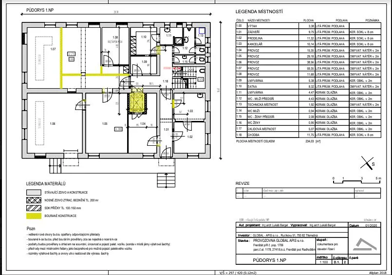 1. NP – o zastavěné ploše 296,99 m2 a podlahové ploše 233,27 m2 tvoří: zádveří 9,75 m2, výtah 3,38 m2, prodejna 11,32 m2, kancelář 10,14 m2, výrobní prostor 15,35 m2, výrobní prostor 29,60 m2, výrobní prostor 38,56 m2, výrobní prostor 59,35 m2, výrobní prostor 11,68 m2, výrobní prostor 5,38 m2, šatna 8,32 m2, umývárna 4,47 m2, WC muži předsíň 4,43 m2, technická místnost 1.92 m2, WC muži 0,94 m2, WC ženy předsíň 2,08 m2, WC ženy 0,95 m2, úklidová místnost 5,07 m2 a chodba 10,57 m2.