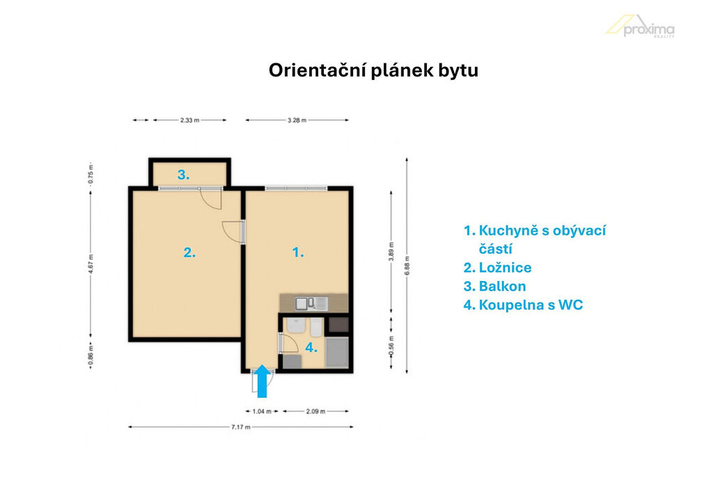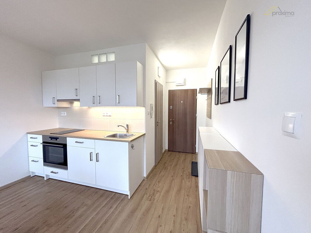 Dispozice: vstupní chodba, kuchyně spojená s obývacím prostorem, samostatná ložnice s výstupem na balkon, koupelna se sprchovým koutem a toaletou. Kuchyňská linka je vybavena spotřebiči: varná deska (dvouplotýnka), el. trouba, odsavač par. V koupelně je k dispozici pračka.