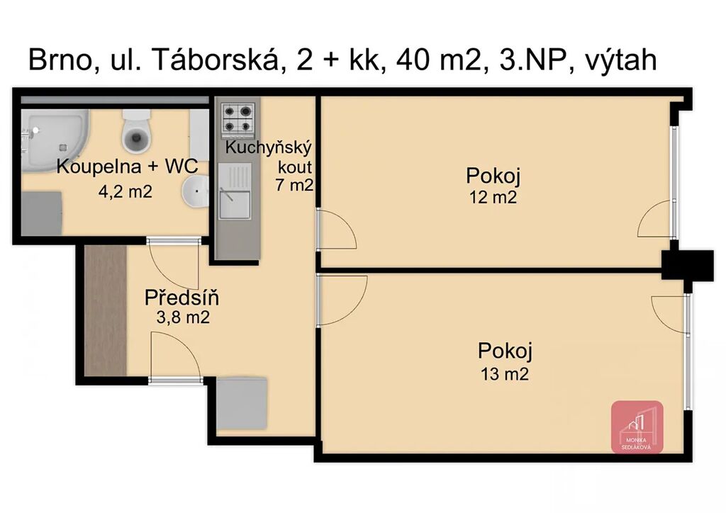 Bytová jednotka 2+kk má celkovou plochu 42 m. Nachází ve 3. NP moderního cihlového domu s výtahem na ulici Táborská v Brně. Součástí bytu je sklepní box (2 m). Byt je orientován na jih, prodává se kompletně vybavený nábytkem a spotřebiči a je připraven k okamžitému užívání.