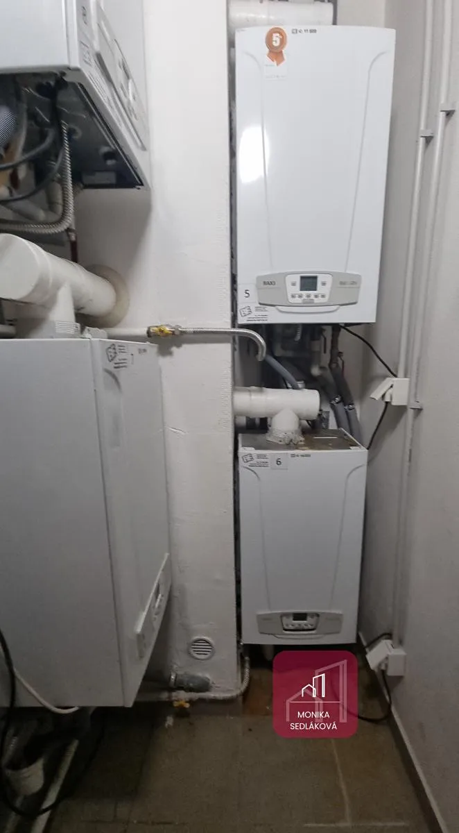 Vlastní plynový kondenzační kotel je umístěný mimo byt. To zajištuje nižší hlučnost v bytě a více prostoru.