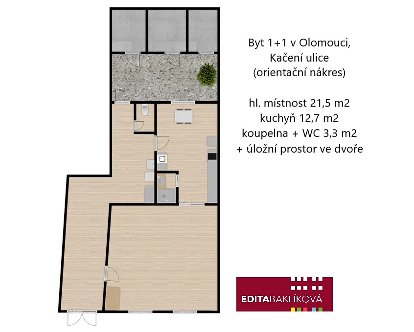 Byt je přístupný z prostorné chodby. K dispozici je kuchyň vybavená elektrickým sporákem a lednicí s mrazákem, malá koupelna se sprchovým koutem a umyvadlem a hlavní obytná místnost. WC je přístupné z chodby a je vyhrazeno pouze pro nájemníky bytu. Na malém dvorku se nachází další úložný prostor, pro úschovu kola apod. Pračka a druhé umyvadlo jsou umístěny v chodbě.