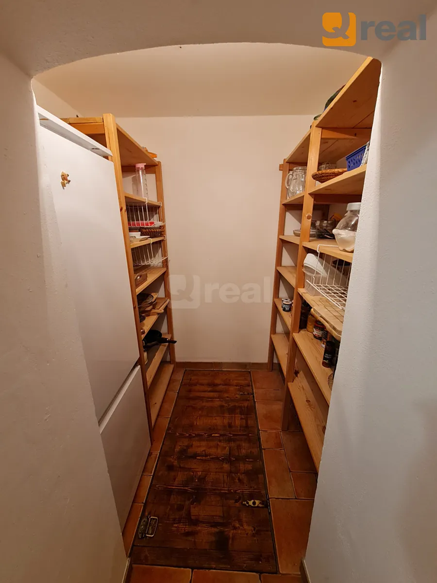 V prakticky navržené kuchyni je plynový sporák s troubou, myčka, lednice, spížka 1,5 x 2 m 2, z které je vstup do chladného sklípku vhodného na uskladnění zeleniny atd.