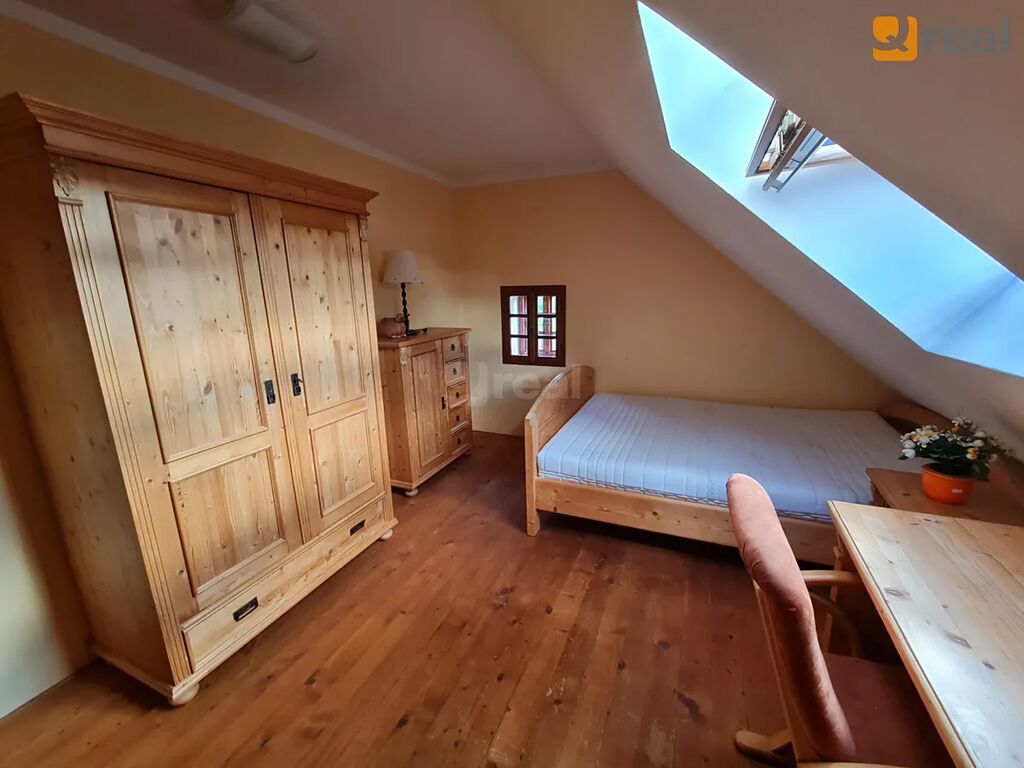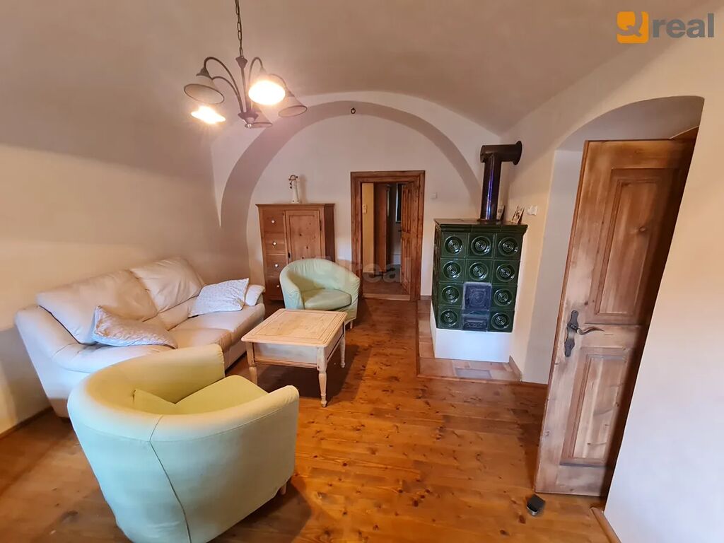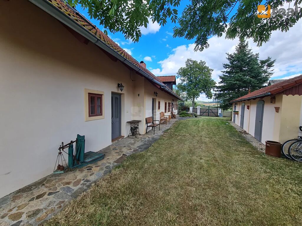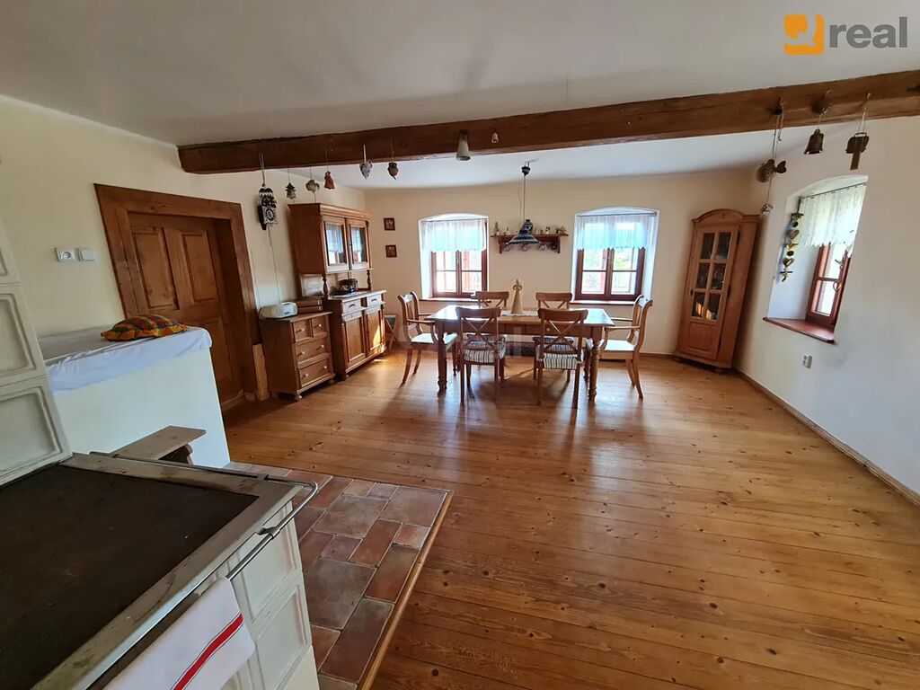 Hlavní budova o dispozici 7 + 1 se dvěma koupelnami, samostatným WC, pěti ložnicemi, kuchyní se spížkou a sklípkem, prostornou jídelnou s kachlovými kamny, pracovnou, obývacím pokojem.
