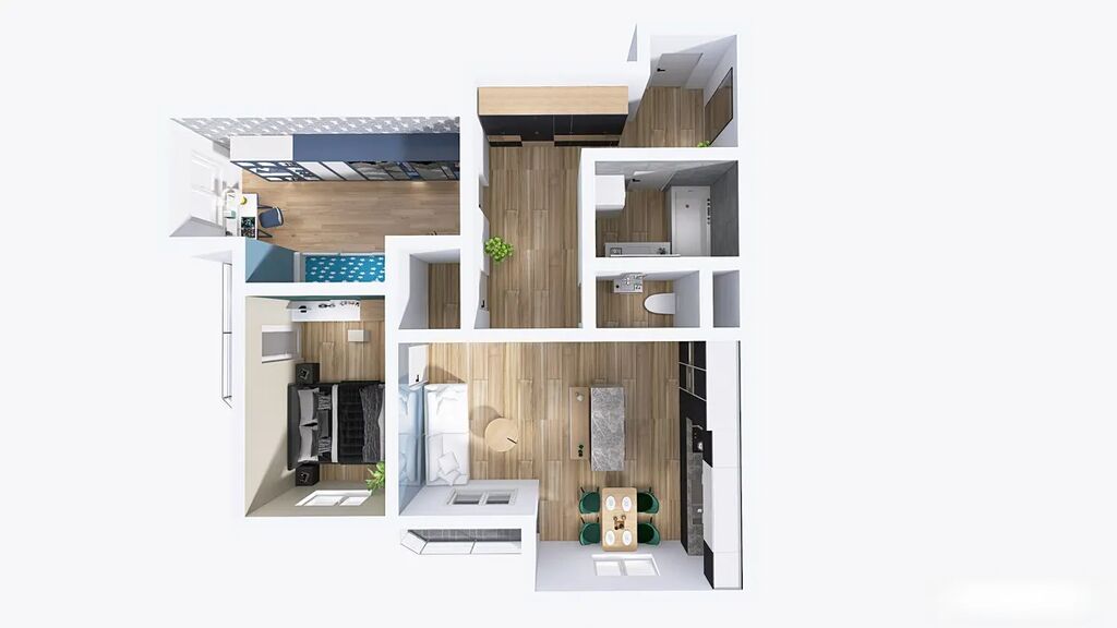 Dispozice bytu je velmi praktická a promyšlená: z předsíně se vstupuje samostatně do dětského pokoje, koupelny, na toaletu, do komory a do obývacího pokoje s kuchyňským koutem. Z obývací části je pak vstup do ložnice. Byt nabízí dostatek světla, úložných prostor a pohodlí pro rodinu, pár i jednotlivce.