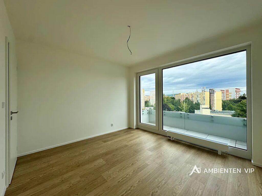 Součástí bytu jsou předokenní žaluzie s možností ovládání přes mobilní telefon, které vám zajistí maximální komfort a soukromí. Kuchyňská linka na míru s kompletními vestavěnými spotřebiči zn. Bosh (myčka, trouba, lednice s mrazákem, indukční varná deska) viz vizualizace. Kuchyňská linka bude dokončena během října 2025. Obývací prostor s kuchyní má výměru 25 m², ložnice 13,1 m², šatna 3,2 m² a prostorná koupelna o velikosti 5 m².