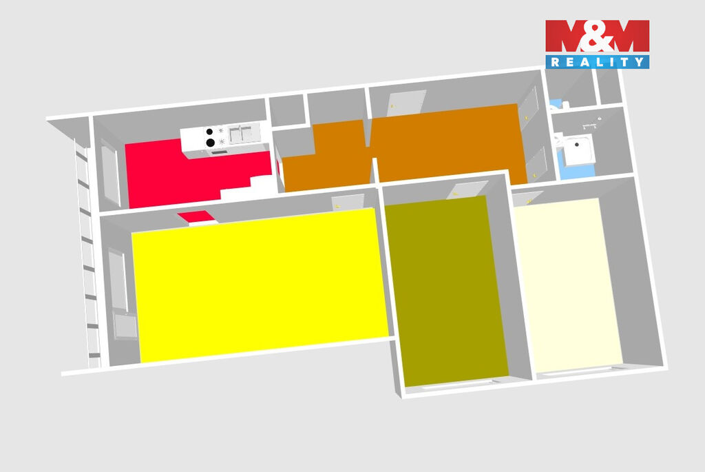 Dispozice: samostatná kuchyně s kuchyňskou linkou a vestavnými spotřebiči, obývací pokoj, ložnice, pokoj, koupelna se sprchovým koutem, samostatné WC. K bytu náleží také sklepní kóje a možnost užívání společné kolárny a sušárny.
