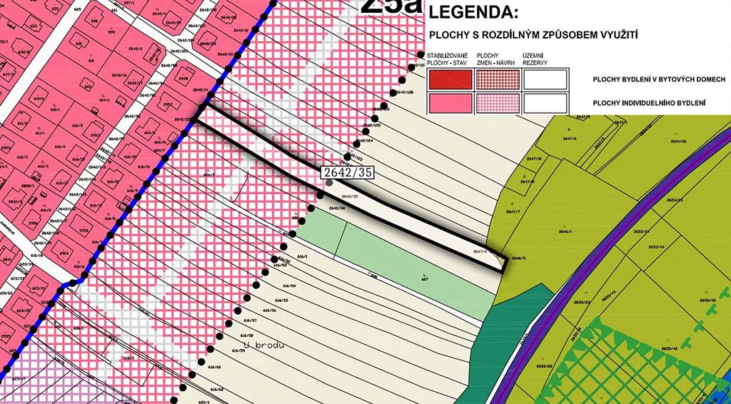 Pozemek 2642/35 má výměru 3 443 m2. Přibližně z poloviny (cca 1 600 m2) se nachází ve stavební ploše individuálního bydlení, ve zbytku pak v ploše zemědělské. Město plánuje rozšíření stávající zástavby a stavební plocha tak navazuje na již existující. V územním plánu obec také počítá s výstavbou komunikace. Blok je umístěn v rovině, nyní slouží jako orná půda.