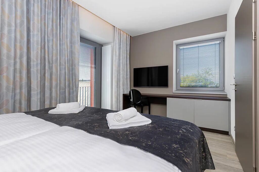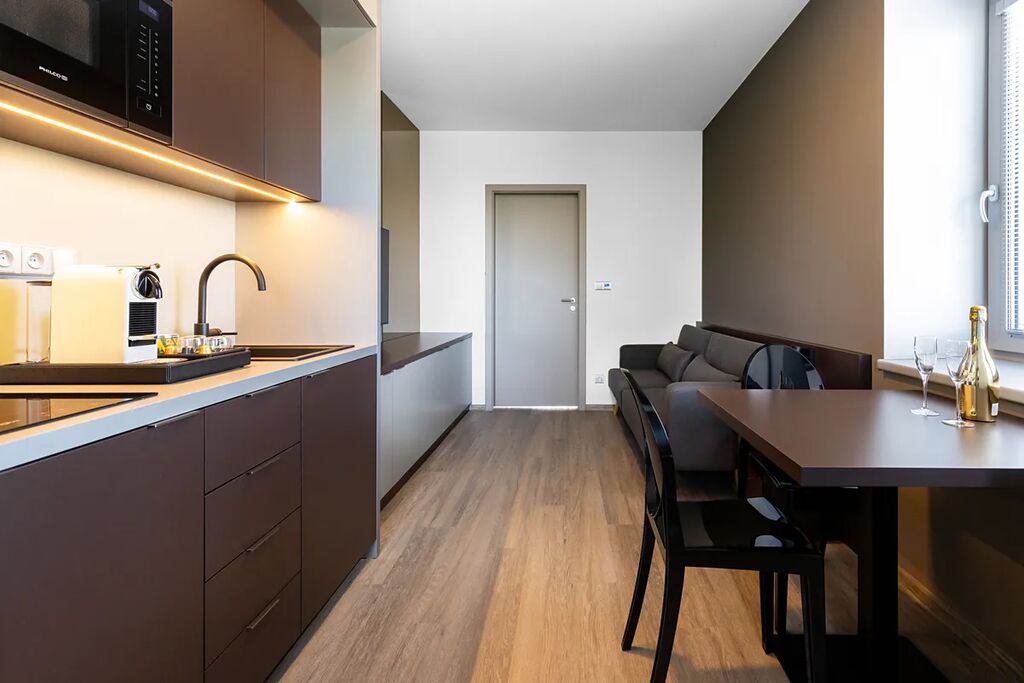 Nabízíme k pronájmu moderně zařízený byt 1+1, o celkové výměře 39 m², ve 4. nadzemním podlaží novostavby s výtahem v Hradci Králové. Interiér bytu je zařízený kuchyňskou linkou s vestavěnými spotřebiči (lednice s mrazákem, varná deska, mikrovlnná trouba). Kuchyň je plně vybavena nádobím k drobnému vaření, jídelní soupravou atd. V místnosti se dále nachází pohodlná pohovka, obývací sestava, jídelní stůl se židlemi. Součástí bytu je samostatný pokoj s manželskou postelí, nočními stolky a lampičkami, spousta úložného prostorů a velká TV. Dále jsou tu dvě velká balkónová okna se vstupem na soukromý balkón, který je vybaven křesly a stolkem s výhledem do klidného vnitrobloku. Z chodbičky je vstup do vlastní koupelny se sprchovým koutem, žebříkovým radiátorem, WC, velkým zrcadlem a vestavěným fénem. Dále je tu možnost zapojení pračky.