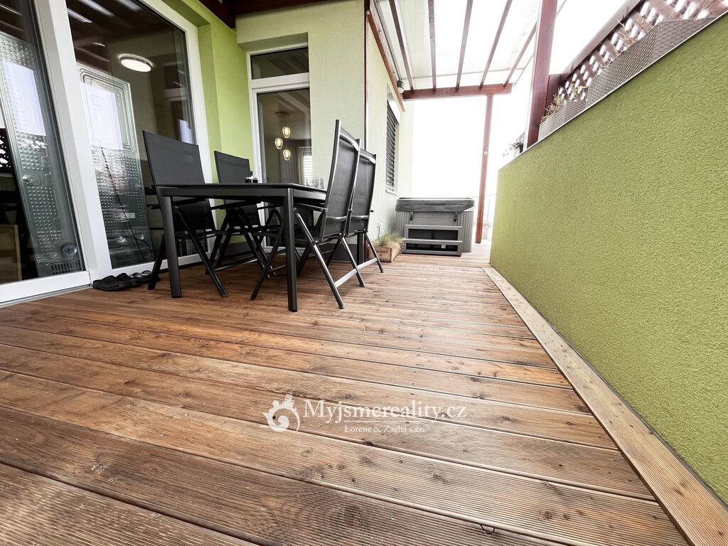 Terasa s modřínovou podlahou je orientována na západní stranu s výhledem na Kraví horu a je přístupná nejenom z hlavního
