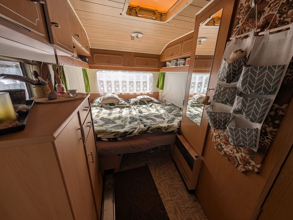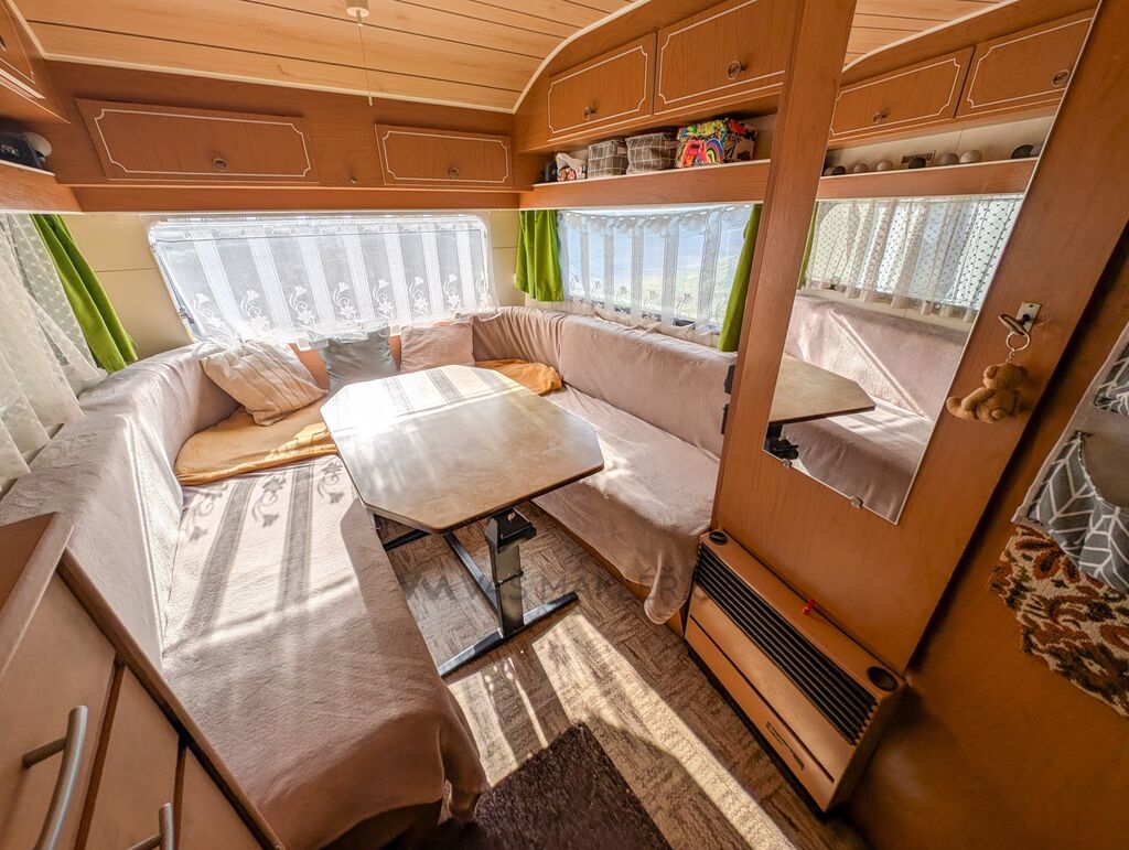 Karavan pohodlně ubytuje 4–5 osob. Uvnitř najdete sezení ve tvaru podkovy, které se dá snadno přeměnit na prostorné lůžko pro 2–3 lidi. Dále je tu oddělená ložnice s posuvnými dveřmi pro vaše soukromí.