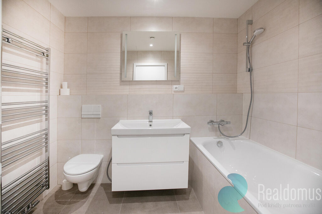 Koupelna je vybavena vanou a WC, stejně jako prostorem pro pračku.