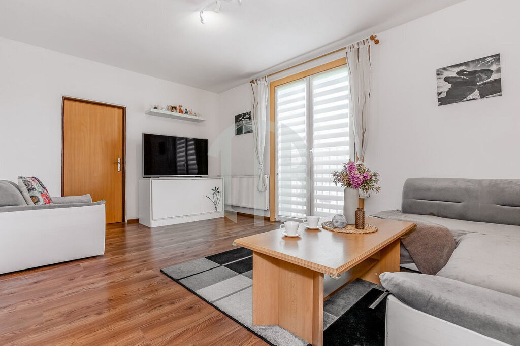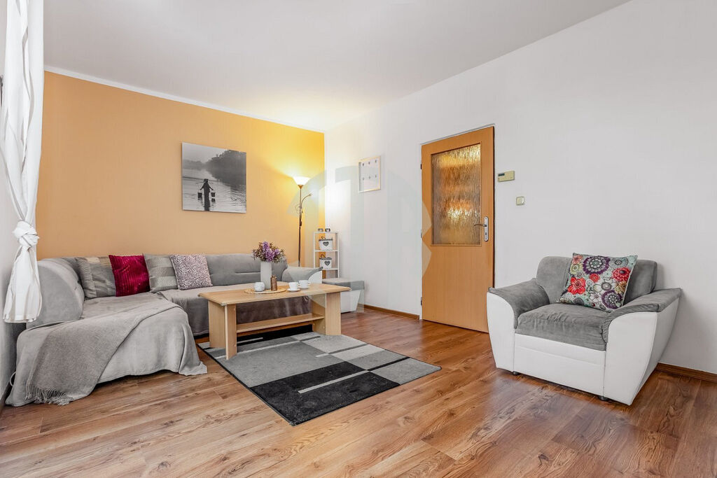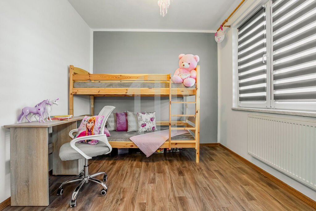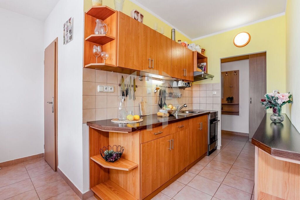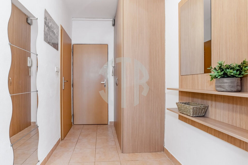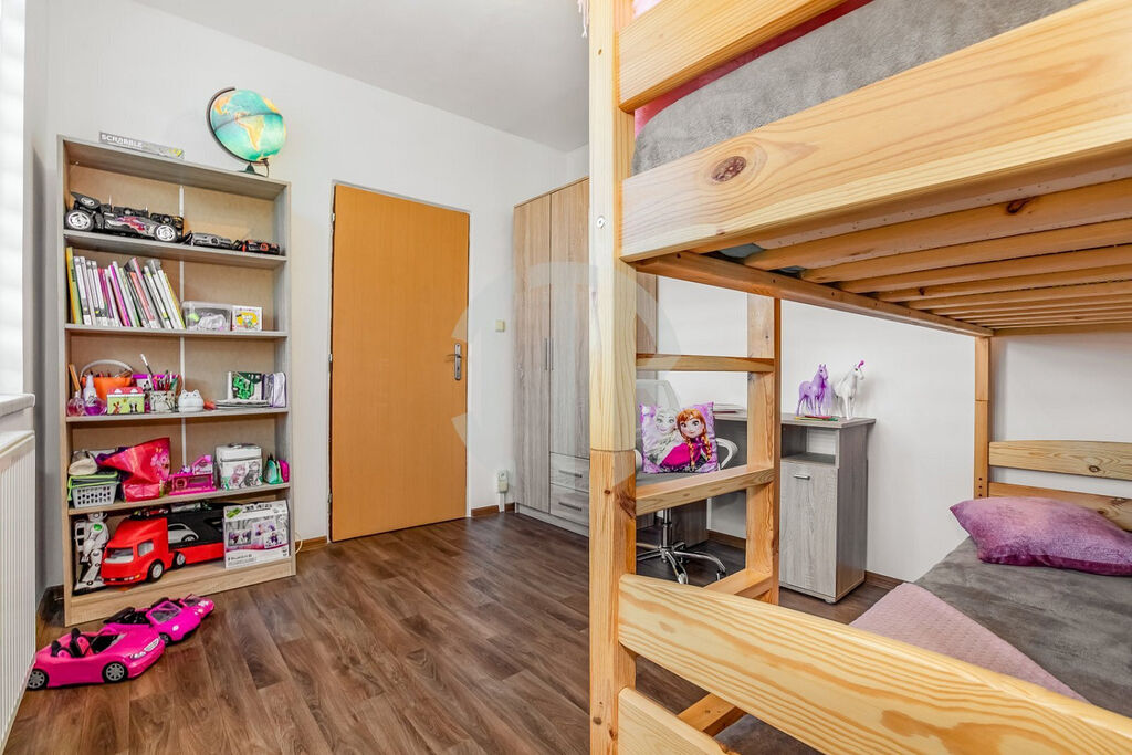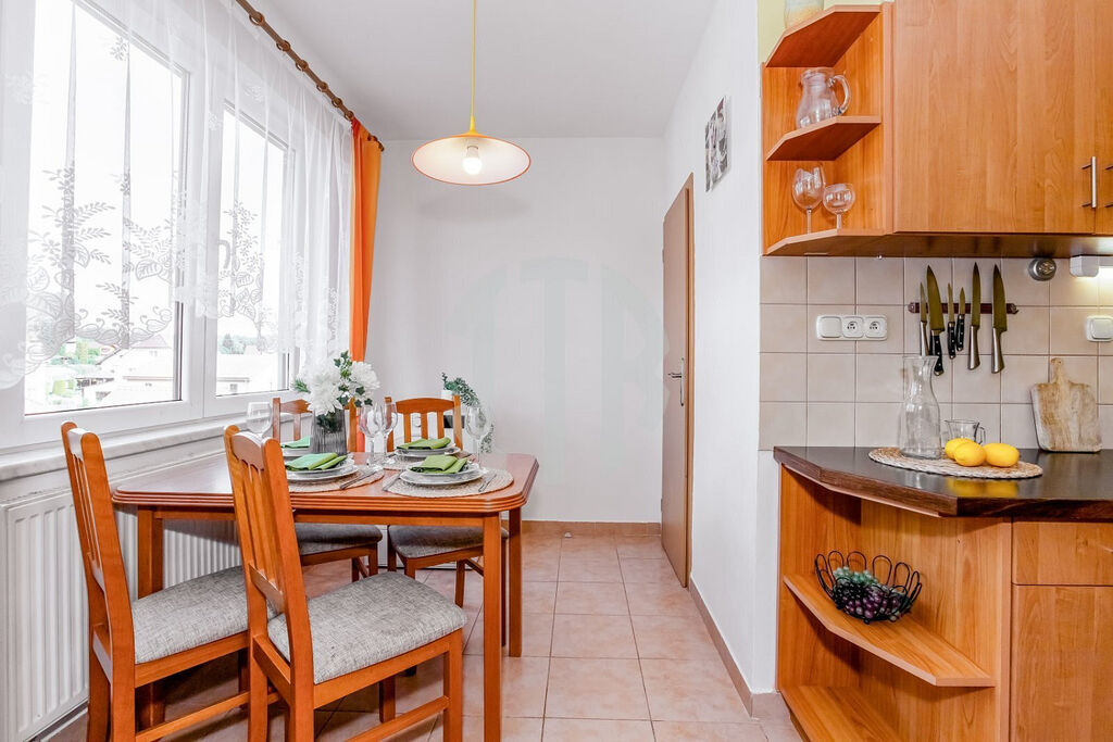 Dispozice bytové jednotky: hlavní vstup do bytu se zádveřím a vestavěnými skříněmi, samostatná kuchyně s jídelnou opatřená kuchyňskou linkou, koupelna se sprchovým koutem, umyvadlem a pračkou, samostatné WC, dětský pokoj, hlavní obývací pokoj s francouzským oknem a ložnice. K bytu náleží sklepní kóje v suterénu bytového domu, možnost parkování osobního automobilu přímo před domem.