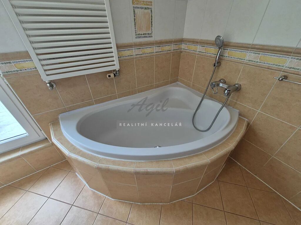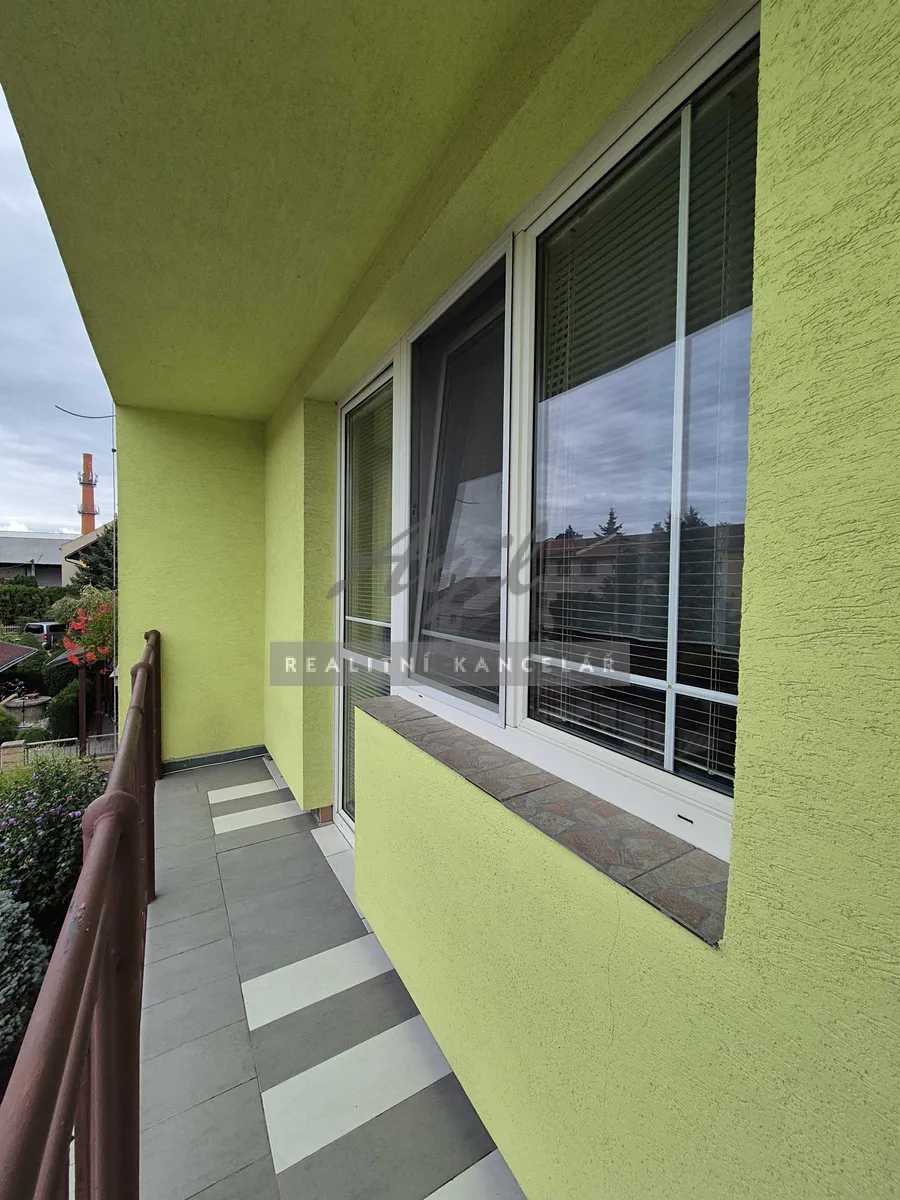 Vstupní chodba společná s majiteli domu, samostatné schodiště do patra, kuchyně s posezením, dětský pokoj, chodba, koupelna s vanou a s WC dohromady a se vstupem na terasu, která je situována do zahrady, terasa, obývací pokoj, ložnice s balkone do ulice, dětský pokoj a 2x venkovní stání před domem.