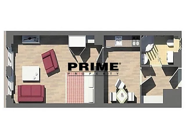 Dispozice bytu: vstupní předsíň, průchozí kuchyň s plně vybavenou kuchyňskou linkou se spotřebiči (sklokeramická varná deska, trouba, lednice s mrazákem, myčka, mikrovlnná trouba plus rychlovarná konvice, kávovar, toaster a nádobí), hlavní místnost s obývací částí a částí na spaní a koupelna (se sprchovým koutem, umyvadlem, toaletou a pračkou se sušičkou).