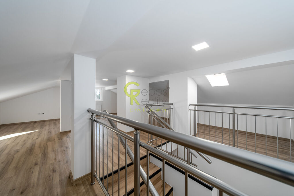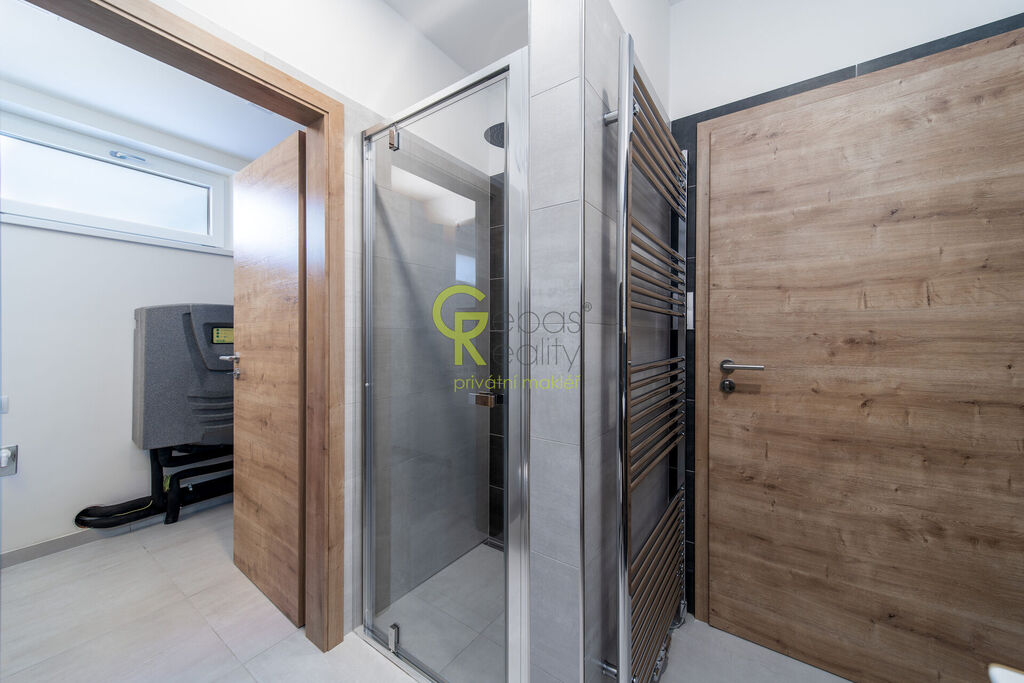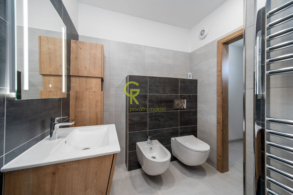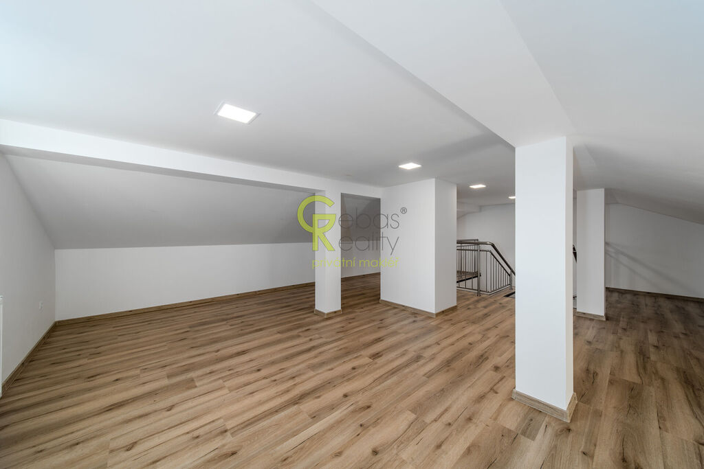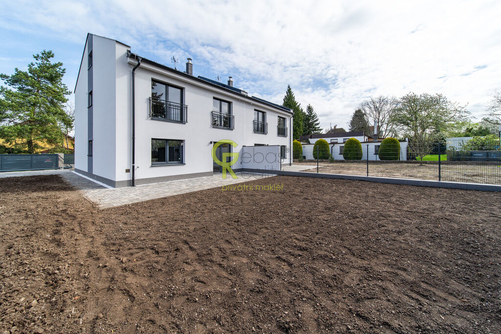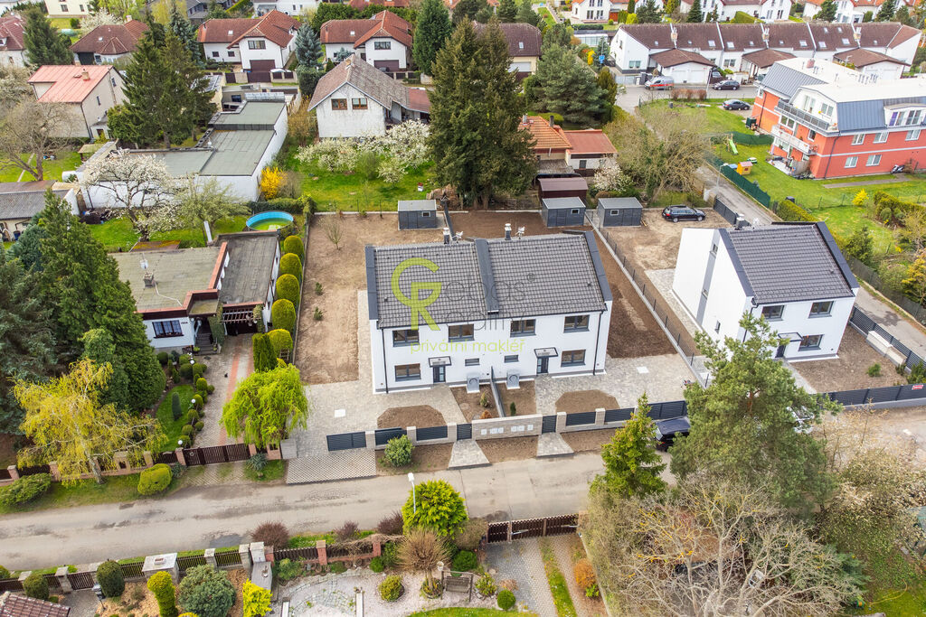 Nabízíme k pronájmu moderní rodinný dům 6+kk s užitnou plochou 186 m² a plně obytným podkrovím 50 m² na pozemku o velikosti 551 m² v klidné ulici Dobřichovská, Praha 21 – Újezd nad Lesy. Dům je novostavba z kvalitních materiálů a nabízí komfortní rodinné bydlení s důrazem na moderní technologie a úsporný provoz. V přízemí se nachází prostorný a světlý obývací pokoj s krbovými kamny a vstupem na zahradu, moderní kuchyňská linka plně vybavená spotřebiči Electrolux a AEG a dvě koupelny s vanou, sprchovým koutem, toaletou i bidetem. Podlahové vytápění v obou podlažích zajišťuje tepelné čerpadlo vzduch/voda, okna jsou plastová s trojskly, schodiště dubové a podlahy keramické a vinylové. Dům je vybaven chytrou domácností (pojezdová brána Somfy IO, Tahoma Switch s ovládáním přes mobil, venkovní žaluzie) a chráněn zabezpečením Jablotron a kamerovým systémem. Úsporný provoz podporuje systém Aquaprof s nádrží 10 m³ pro využití dešťové vody k zalévání a splachování toalet. Pozemek je oplocen, plochy jsou z elegantní dlažby Citytop a k dispozici je také zahradní domek 3×4 m. Zahrada je již plně zatravněná a připravena k okamžitému užívání. Dům je ihned k nastěhování a nabízí skvělou kombinaci komfortu, bezpečí a nízkých provozních nákladů v příjemné lokalitě s dobrou dostupností do centra Prahy.